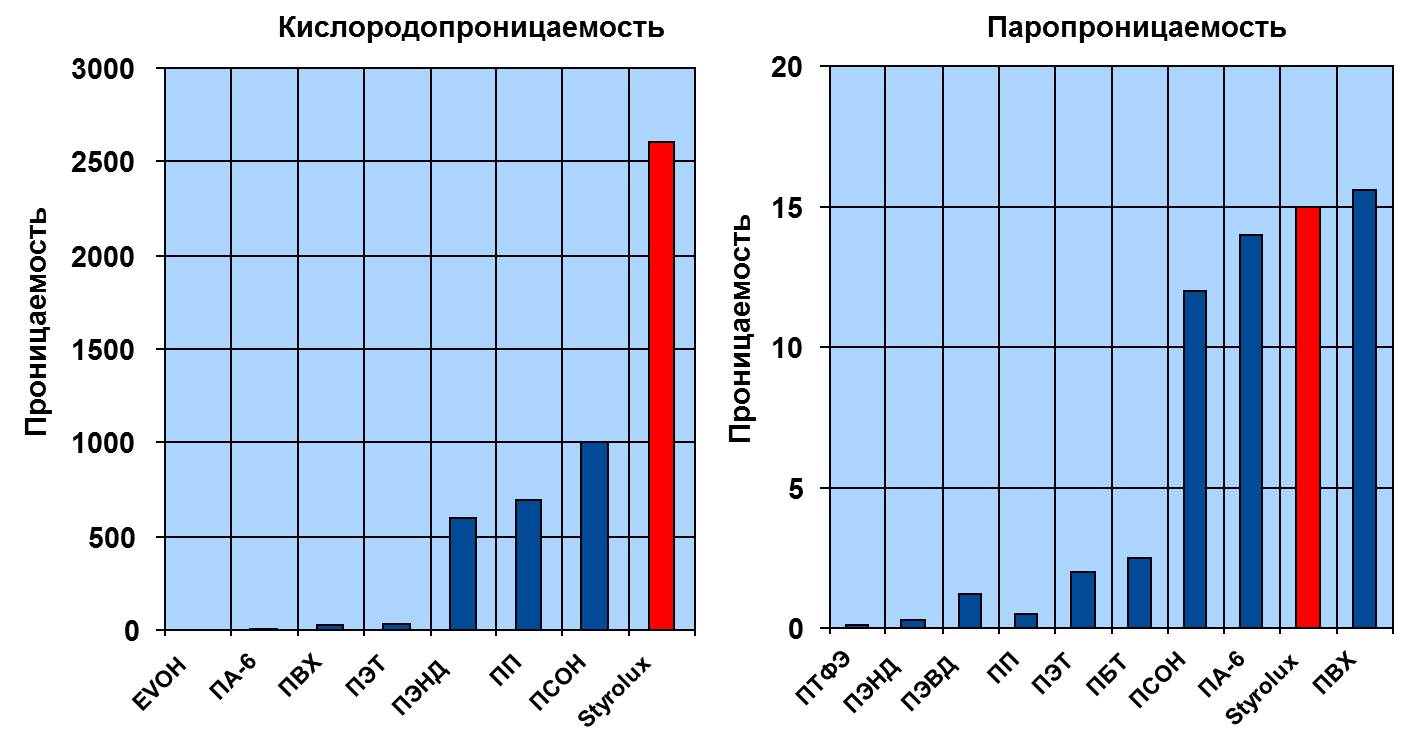 Помимо жесткости и теплостойкости, отличающей пленки из ПС/СБС от полиолефинов, следует отметить высокую кислородо- и паропроницаемость стирольных пленок (отсутствие запотевания, сохранение цвета мяса) Стиролюксы весьма термостабильны (в отличии от обычных СБС-каучуков) и не склоны к сшивке в шнеке. УФ-стойкость Стиролюксов весьма посредственная, так что часто возникающий вопрос о применимости Стиролюксов для листов в светотехнике вызывает изрядный скепсис у моих немецких коллег.
