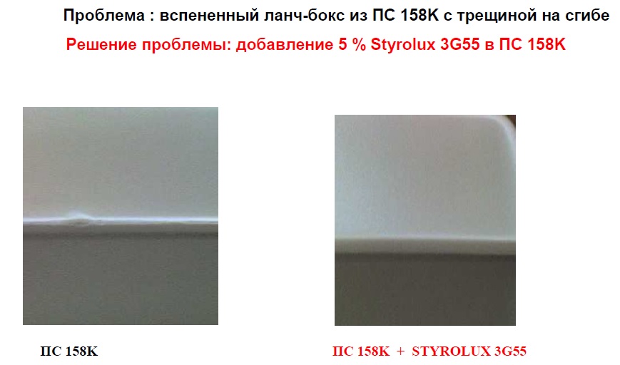 Продолжая тему упаковки, можно коснуться упаковки из экструзионного вспененного полистирола (XPS). Конечно, при производстве ванночек неглубокой вытяжки из XPS ленты никакого СБС там не надо. Например, была проблема с растрескиванием ланч-боксов (первичка/вторичка 50:50) на сгибе. При добавлении Стиролюкса (использовался 3G55) плотность пены выросла, затем ее вернули к исходному значению, снизив дозировку нуклеатора (добавление Styrolux 3G55 в ПС придает нуклеатору более высокую эффективность, позволяя создавать больше центров порообазования).