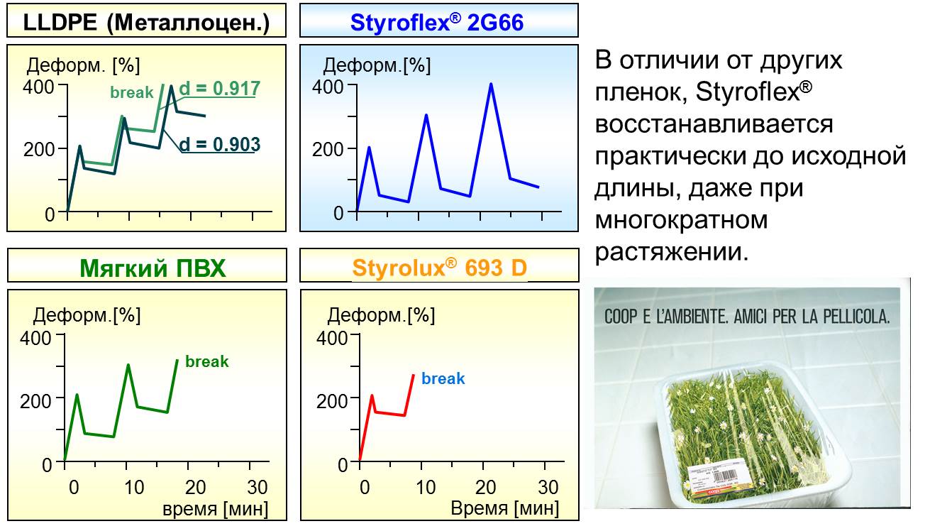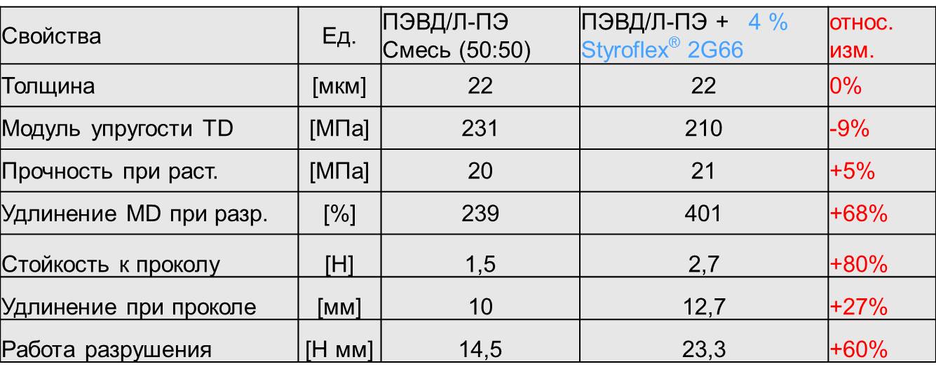 Замечено было, что Styrolux 3G55, делая стенку ячейки прочнее и эластичнее, позволяет поддерживать рост и стабильность ячеистой структуры в полистироле, образуя структуру с закрытыми порами. В итоге за счет прочности стенок и большого процента закрытых пор получили более жесткий материал при той же плотности, соответственно можно снижать толщину стенки, экономя на материалоемкости. ТВИСТ-ПЛЕНКИ