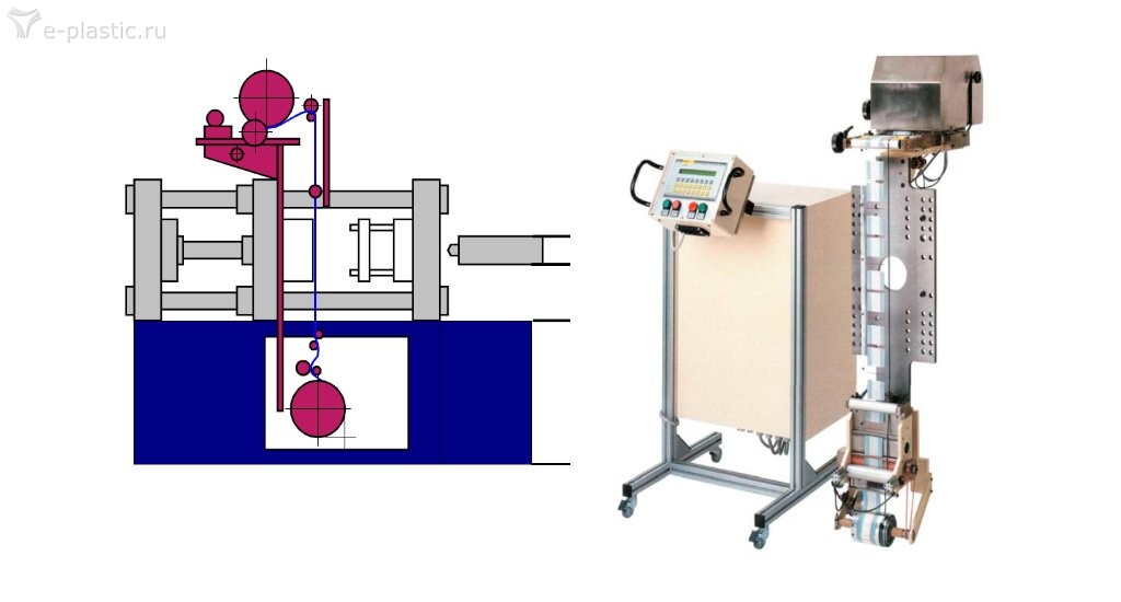 Рулон отформованной пленки с нанесенным типографским или иным способом декоративным изображением устанавливается на машину. Конец рулона протягивается через литьевую форму и фиксируется точно между ее половинами. В процессе литья расплав полимера контактирует с ней таким образом, чтобы после удаления подложки декорированный слой остался на поверхности изделия.