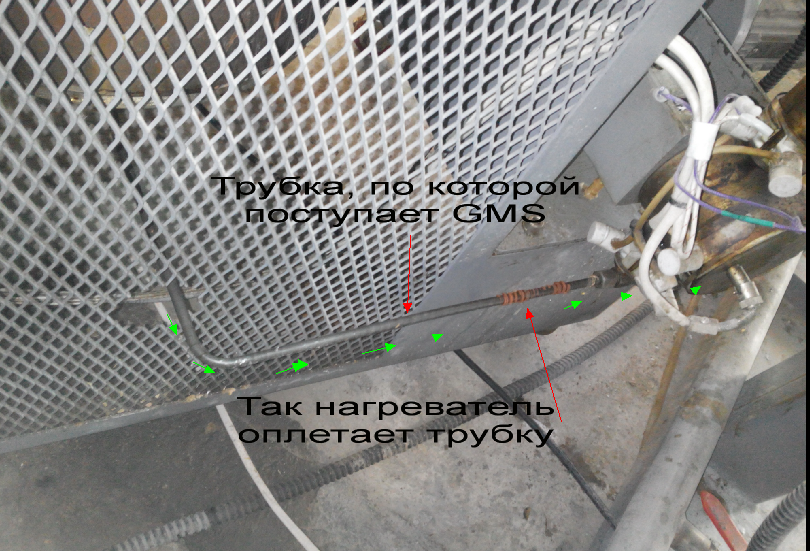 Нагреватель представляет собой проволоку из нихрома, укутанную в изоляцию из негорючей ткани, а сверху в резиновой изоляции (держащей температуру свыше 130*). Подключен он к датчику регулятора температуры на узле "впрыска воска (GMS)".
