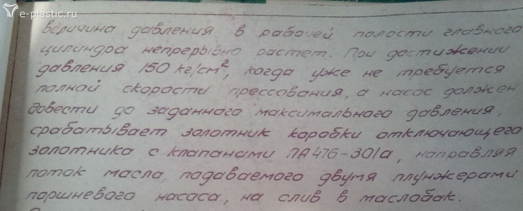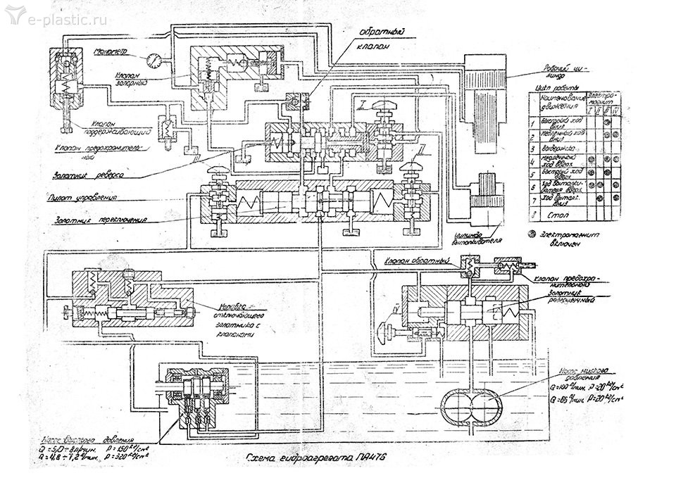 На счёт 1000 тонн приврал, 100 тонн. Называли все тысячник. Наверное 1000КН. Насосы такие же , аппаратуру не помню.ЗЮМ писал(а): ↑14 апр 2021, 21:34https://disk.yandex.ru/i/LXnGsPblsOr_HQРазобраться в принципе работы не сложно.Вижу в первый раз можно сказать. Собираем материал для размышления. Скачиваем похожие станции.Распечатываем схемы. Нашли четыре варианта Разных годов исполнения. С трудом нарыли описание 69 года выпуска. Мысленно превращаемся в жидкость и лезем в трубу. Циклограма есть. Старички местные читать не хотят и вроде как не все понимают. И копают все подряд. Работали с похожим прессом 1000 тонн усилия. Давили знаки для прессформ в 70 году. Не вникал. Меняли большой манжет чуть менше метра в диаметре. А этот пресс вроде 160 тонн. мелкий можно сказать. Описание в ссылке. Рязанский завод.Совет и вероятная причина управляемый запорный клапан - гидрозамок. Проверить. №13. (((((((((((Коробку с отключающим золотником и клапанами копать смысла нет, если есть давление управления 15-20 кг. И силовое давление нагрузки верхнего цилиндра.