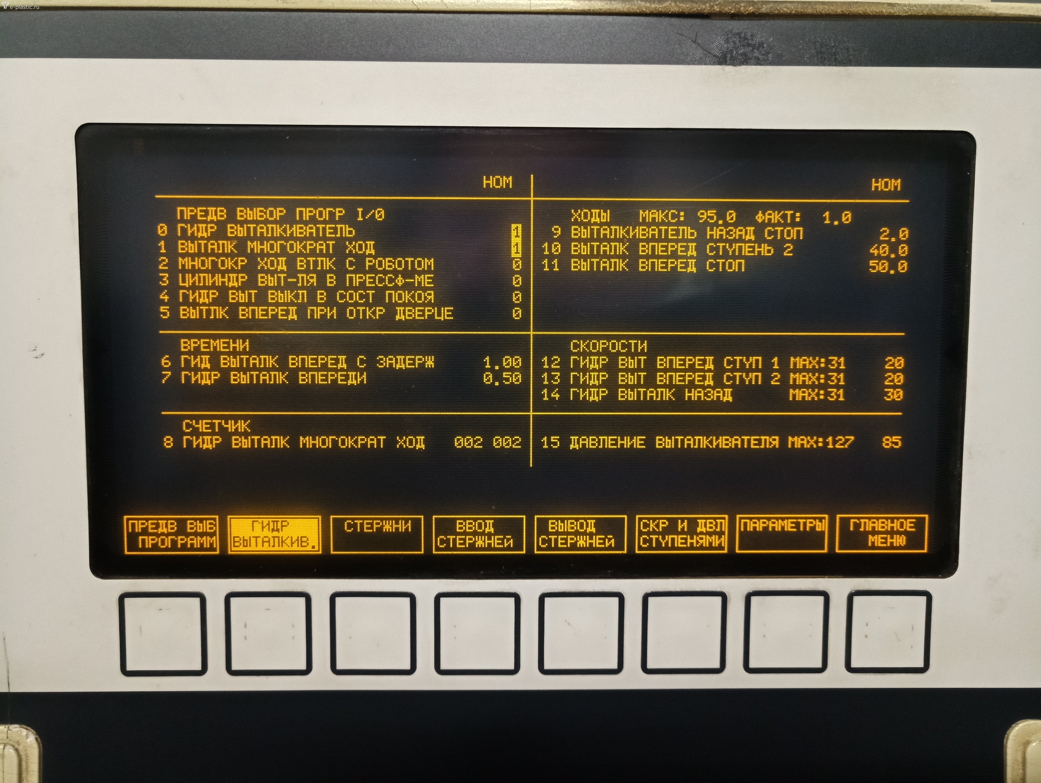 Эх, хорошо бы у Вас вторая такая машина имелась. Метод сравнения рулит. Ладно. Тогда в наладке проверяем. На меню Давления 12-й параметр Наладка макс. 50. Последовательно задаём значения от малого через 5 Бар и прогоняя подвижную часть следим за изменениями. Если с увеличением давления наладки дерганье уменьшается, а скорость смыкания заметно растёт, то, возможно, просто направляющие не смазаны. Смазать солидольчиком и погонять туда-сюда для равномерного распределения смазки по поверхности направляющих. Ну это Вы и сами регулярно проделываете, уверен.