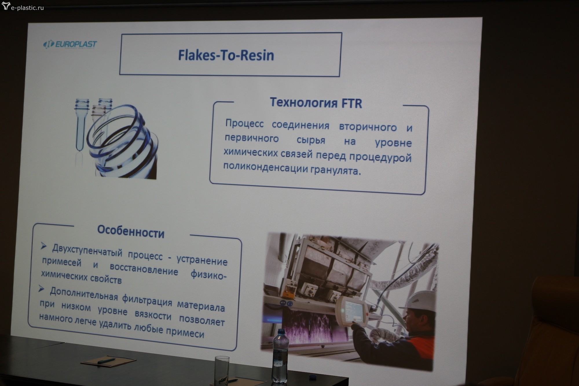 Завод много работает по технологии Flakes-to-Resin «хлопья-гранулят». Технология представляет собой процесс, когда в первичный материал на этапе расплава вводится очищенный расплав вторичного гранулята с последующим формированием гранулы. В рамках этой технологии хлопья регранулята проходят предварительную двухступенчатую очистку (1. мойка и 2. фильтр экструдера) и финальную очистку реПЭТа в реакционной колонне.