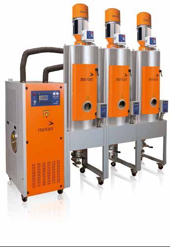 В режиме частой смены материала основным достоинством системы сушки является максимальная эффективность при минимальном техническом обслуживании. Поэтому в трёх сушильных бункерах, согласно текущим потребностям, готовятся разные типы сырья. Это позволяет задействовать одновременно три термопластавтомата. На время смены материала в одном сушильном бункере можно продолжать сушку в двух других, по максимуму использовать ценное производственное время. Генератор сухого воздуха оснащён двумя объёмными патронами с абсорбентом, попеременная работа которых обеспечивает непрерывность процесса сушки. При регенерации воздух подогревается в теплообменнике, что экономит электроэнергию. Обратное охлаждение молекулярного сита происходит в закрытой системе. За счёт этого достигается постоянная низкая точка росы и стабильная эффективность сушки.
