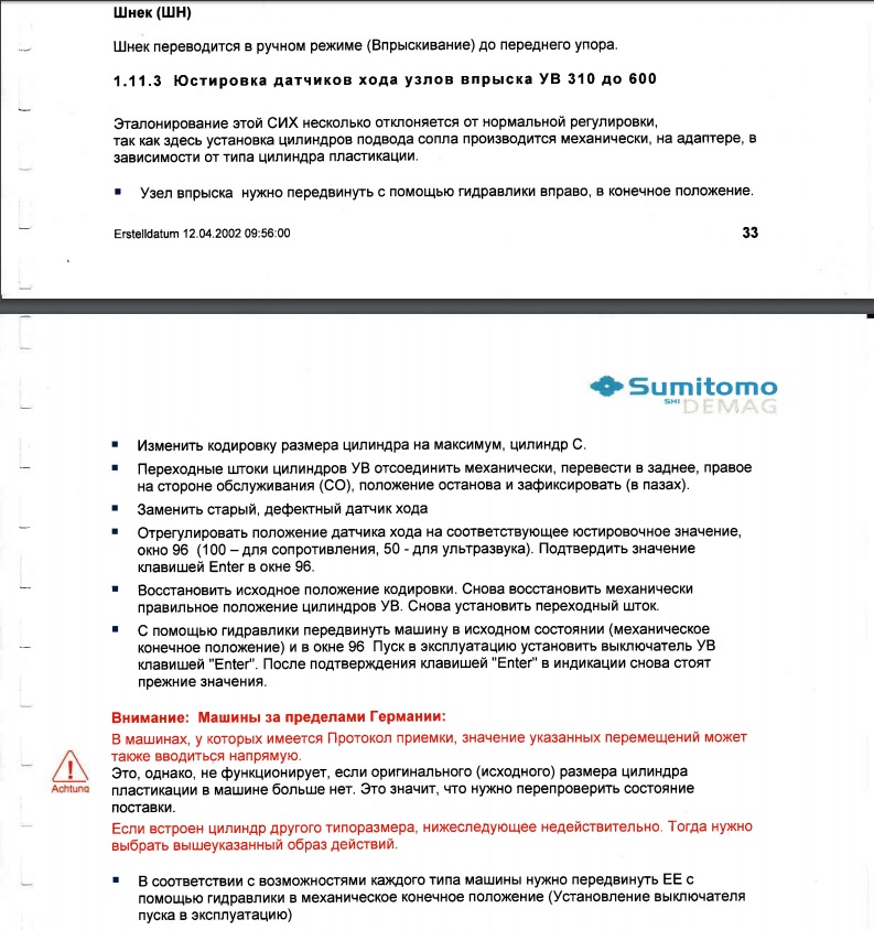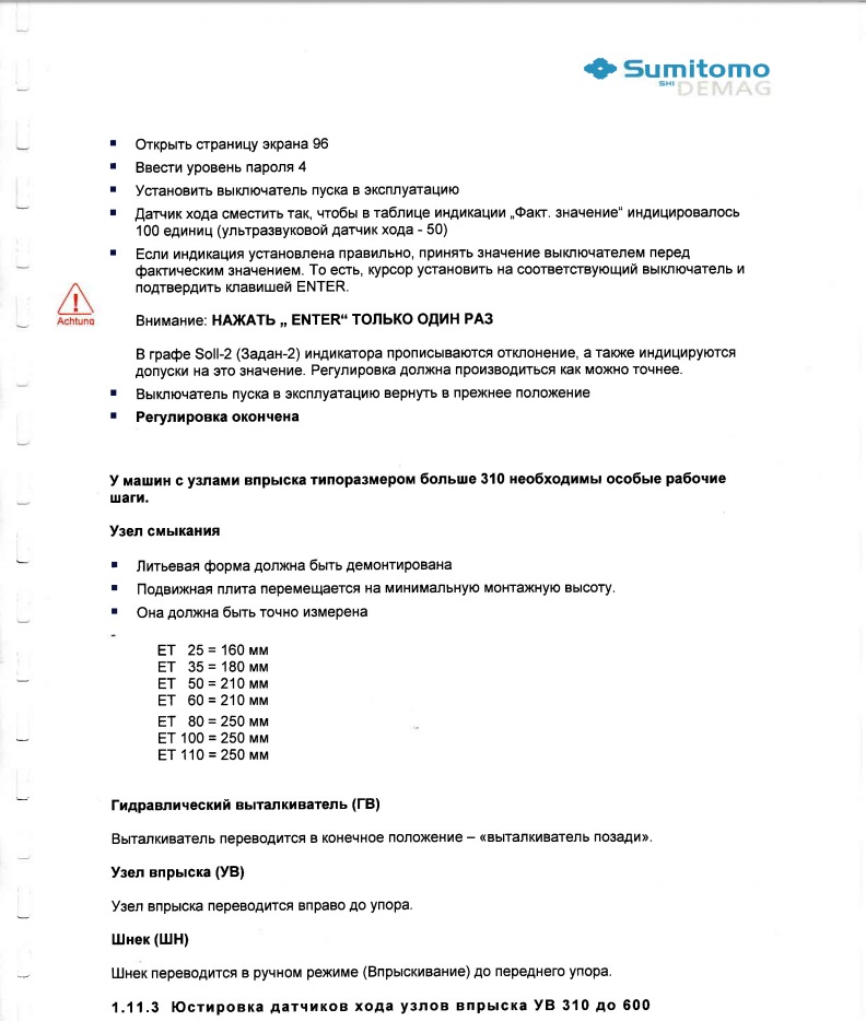 Описания гидравлики к сожалению в книге нет. На гидравлической схеме не совсем понятно, является цилиндр мультипликатором, или выполняет функцию поплнительного бака. Судя по конструкции, все таки скорее всего он и создает усилие смыкания (массивный чугунный корпус, крышки на большом количестве болтов). Alexbux1 полезные листы выложил. Однако у нас Ergotech, ну думаю разницы не будет. Узел смыкания наверное такой же. Из этого листа только непонятно вот что: если значения ЕТ отличаться будут, как их скорректировать? И еще - с какой машины это взято? Там где МП с линейкой или с концевиком?