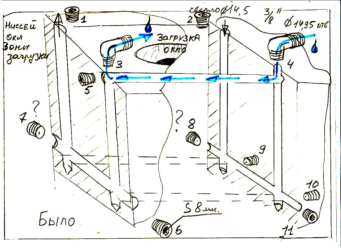 С контуром охлаждения разобрались и почистили каналы очень легко без химии. механическим путем. Черновик схемы подправили, синим было соединено каким то спецом в надежде что заработает циркуляция. Штуцера поставили согласно стрелок и восстановили полный контур.ЗЮМ писал(а):При проверке охлаждение зоны бункера работало так. Или по другому ни как. Завтра начнем ковырять. Без всякой химии. Химия эффективна когда есть хотя бы хилый проток по контуру. Почему заостряю внимание на этом вопросе? Потому что порой нужно совсем не много времени на очистку кольца охлаждения этой конструкции. После попытки ремонта ,отпишимся с фото. судя по количеству пробок даже и не сообразишь как циркулирует вода. Будем соображать совместно с чисткой и продувкой каналов.