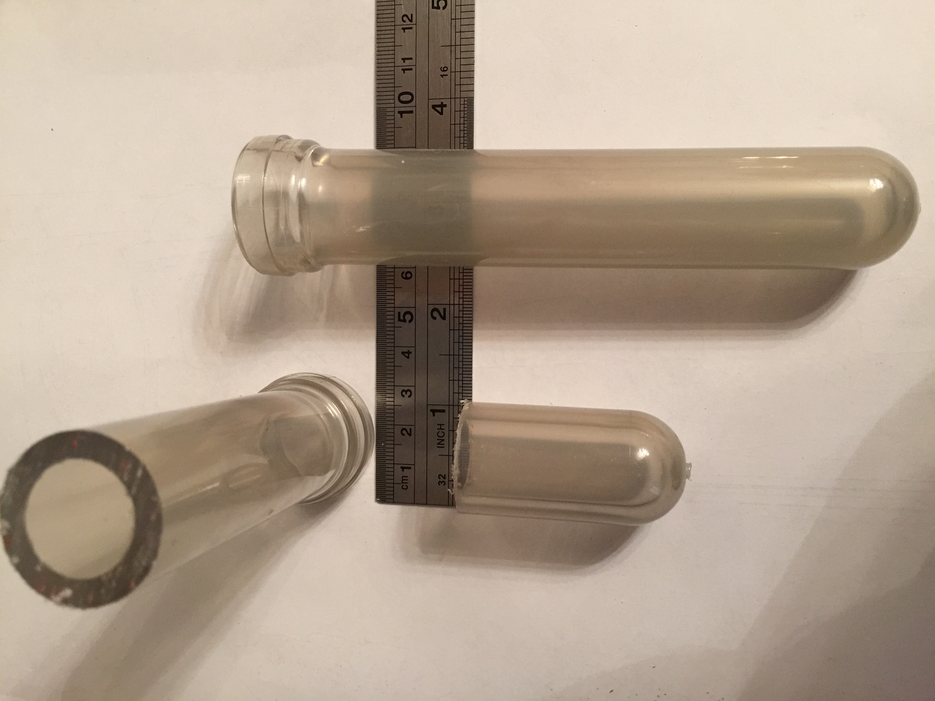 Было бы очень неплохо оценить вязкость материала обеих преформ (чтобы понять, насколько критична ситуация с влагой и термодиструкцией у Вас). Нормально при литье преформ снижение вязкости материала составляет до 0,02. Если существенно больше - имеются проблемы с сушкой/параметрами литья.