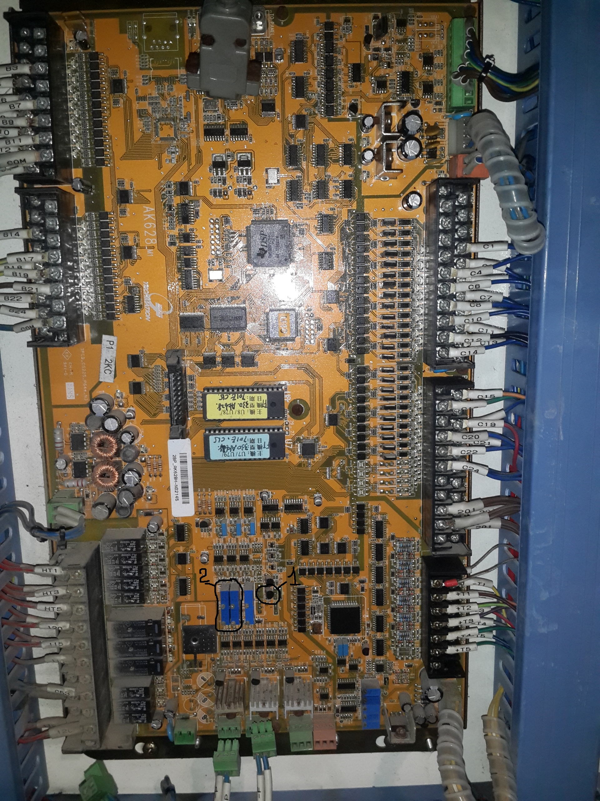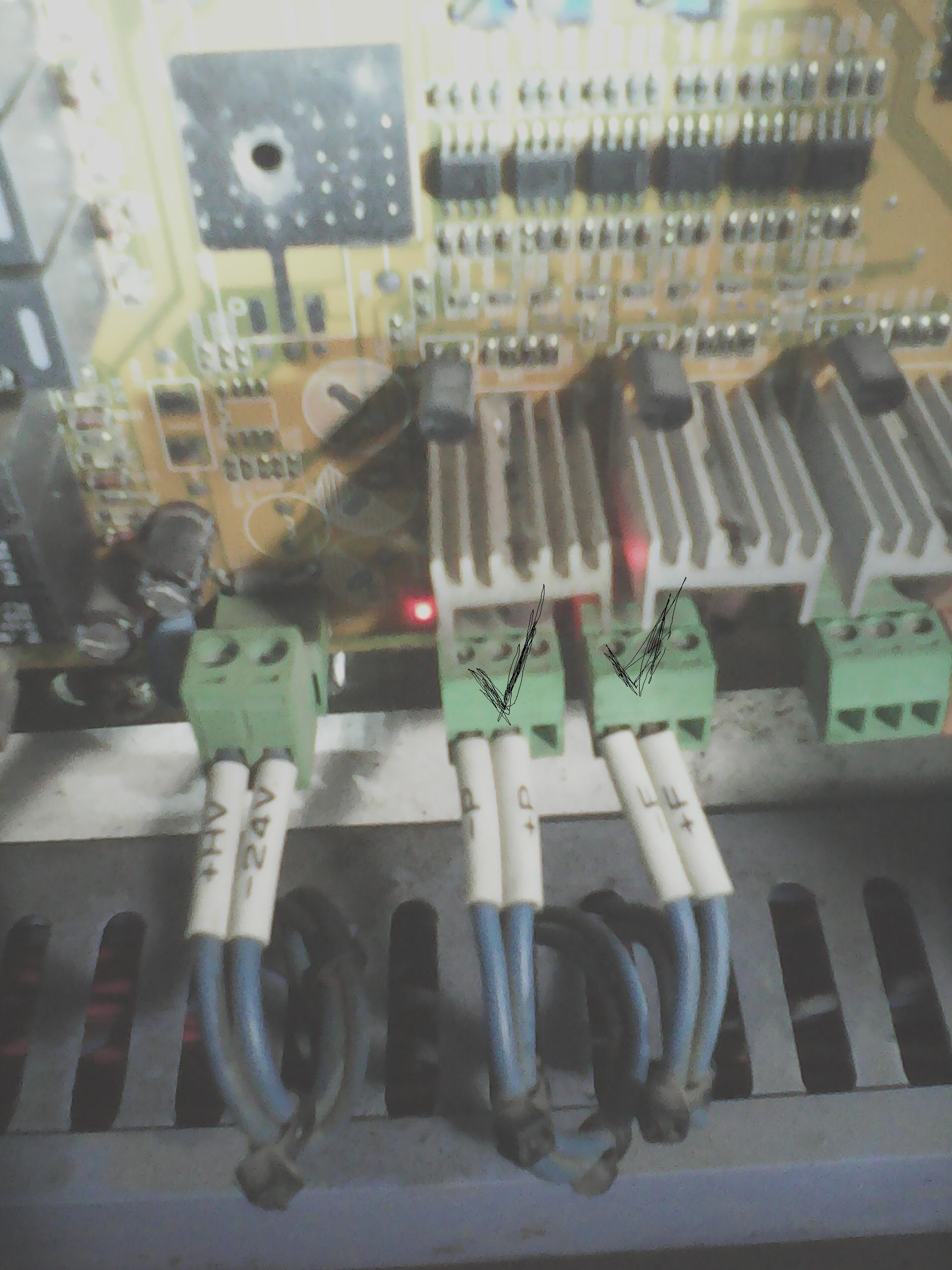 Прям над этими фишками что вы отметили стоят транзисторы на радиаторах.Это и есть управляющие транзисторы...а провода идут сразу на пропорциональники через амперметры.Транзисторы исправны.ПластСтер писал(а):Посмотрите куда идут провода, которые отметил на фото. Они и должны идти к транзисторам. Вот их и прозвоните.