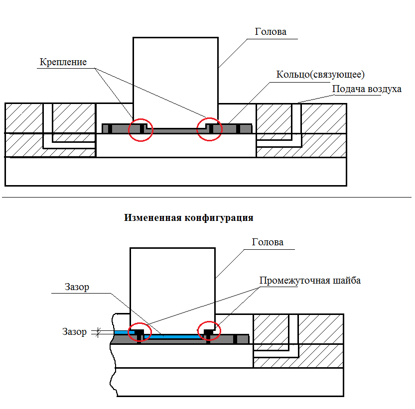 Добрый день! Замечена потеря температуры в зоне головы до 15°C, в следствии увеличения обдува. Возможная причина: на рис1, видно что голова крепится к грибу обдува через соединительное кольцо которое плотно прилегает к деталям с обоих сторон. Думаем создать зазор между деталями по средству разрыва их промежуточной шайбой. Есть ли смысл в изменении связующей конфигурации?