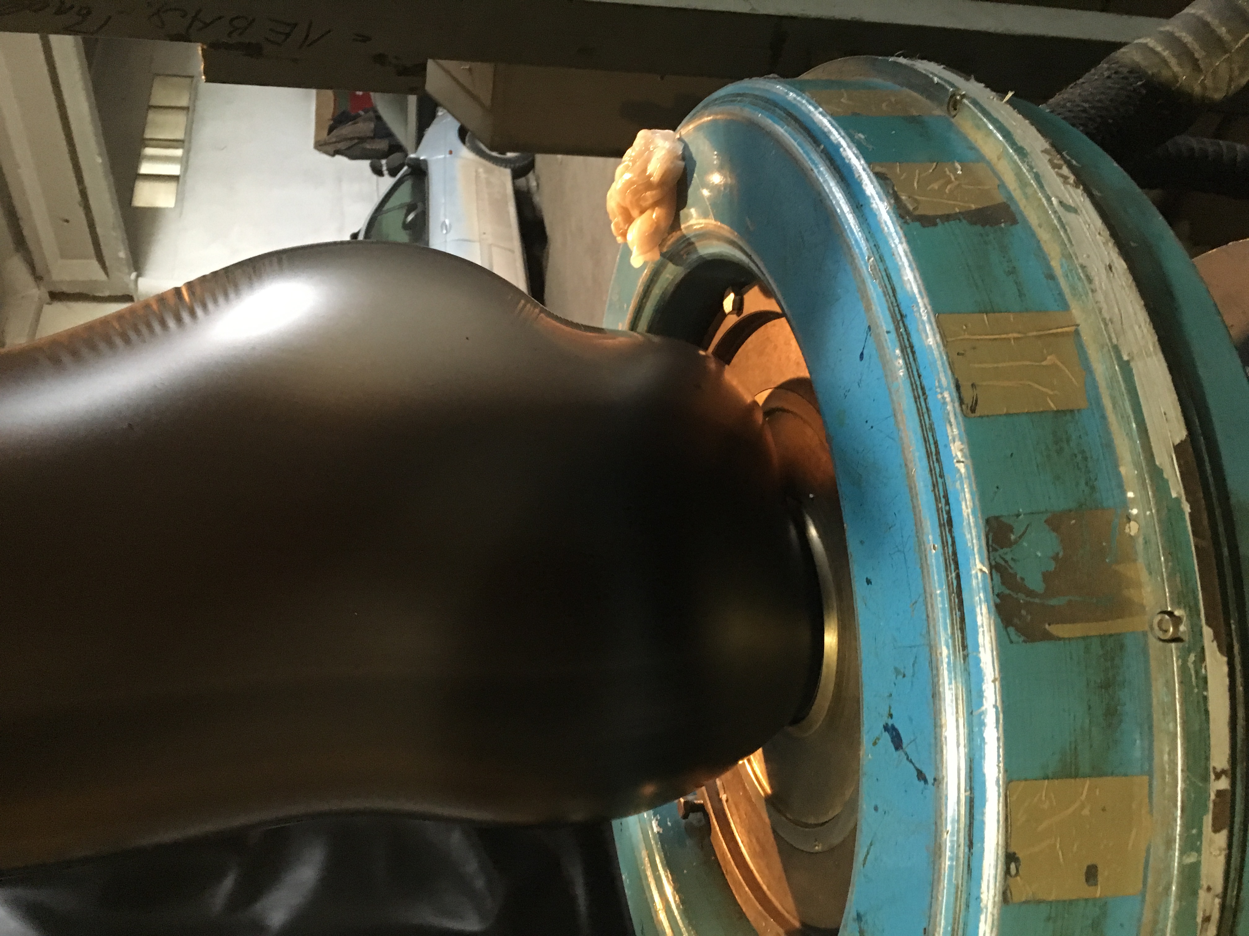 Здравствуйте. Сегодня раздули до 840 (фото) мотали,но все же решили делать 750мм,но и при томи той ширине,все так чулок ведёт себя не предсказуемо,все таки вторичка есть вторичка. Закончилась смена тем что неожиданно чулок ушёл в верх и так и не смогли раздуть вновь,оборвался,как ни добавляли ни обдув,ни подачу шнеком.