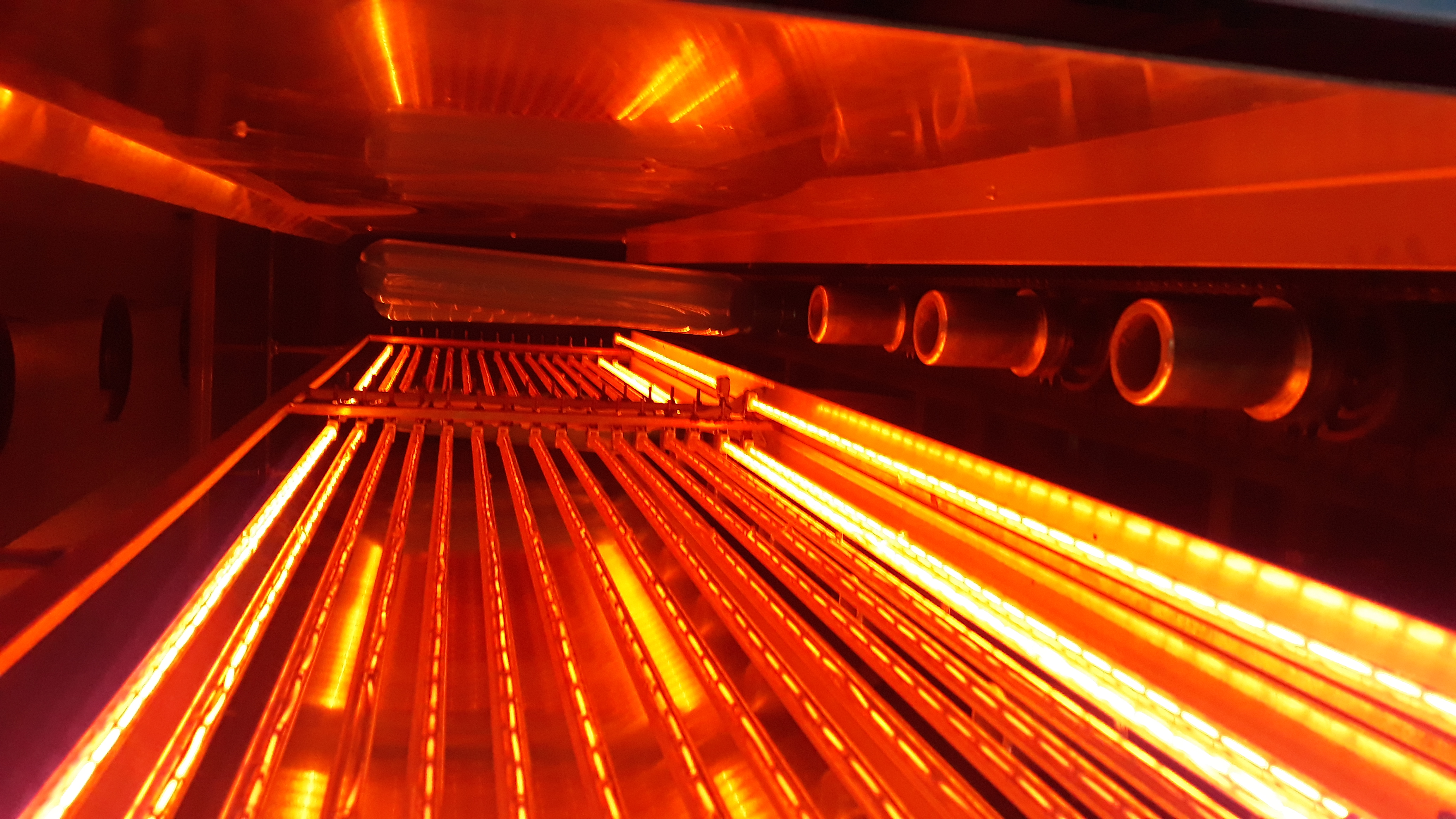 Время в печи - 3 минуты 15 секунд. Используются лампы. Насчёт расстояния ничего не могу сказать.