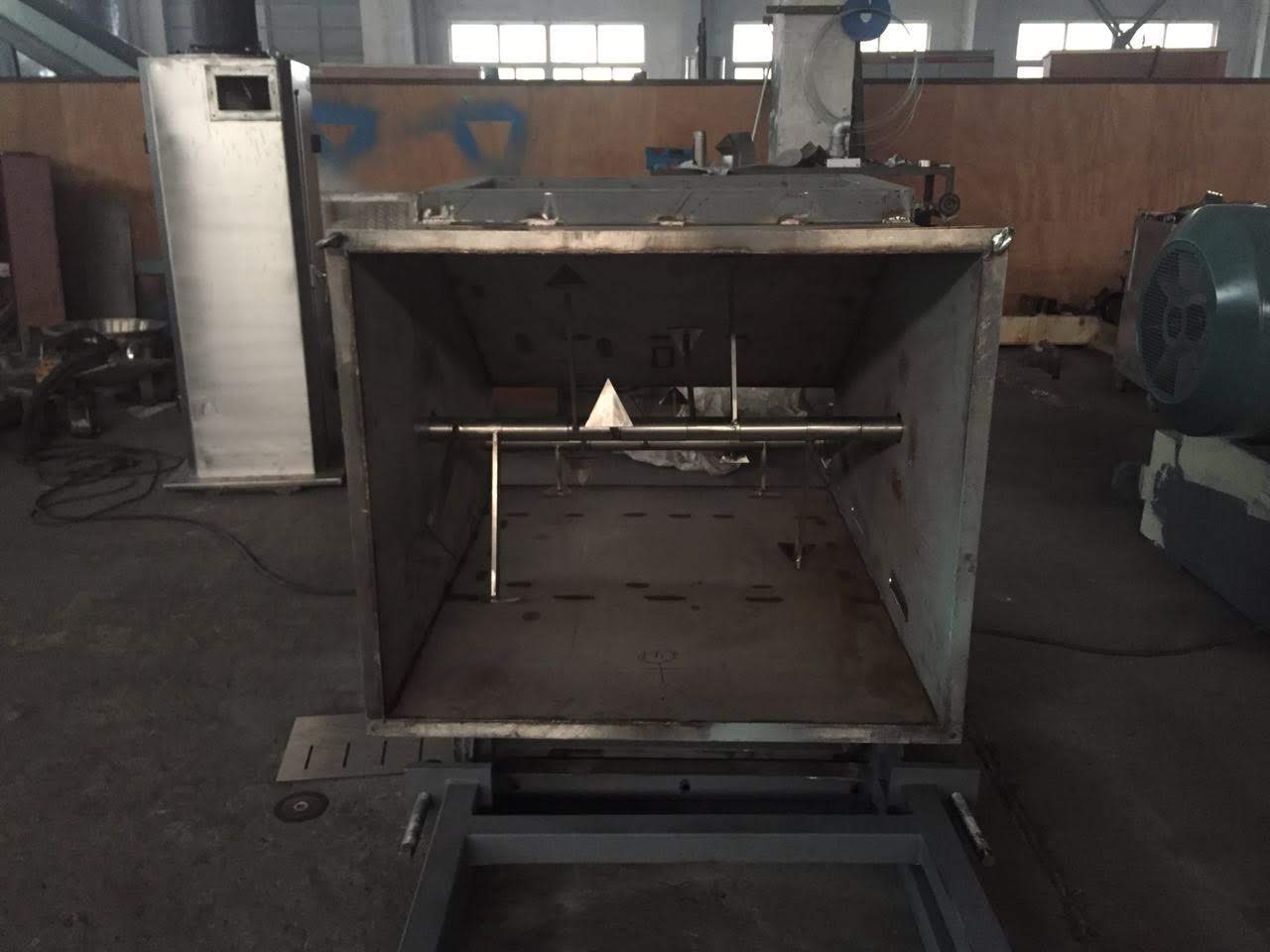 Этот приборчик- датчик уровня заполнения бункера. Дал ранее неправильную информацию. По заполнению бункера материалом, датчик даёт команду остановки на загрузочный ленточный транспортёр. А виброгенератор установлен ниже этого датчика. На фото можно это увидеть. И фото бункера изнутри с валом ворошителя не переднем плане.