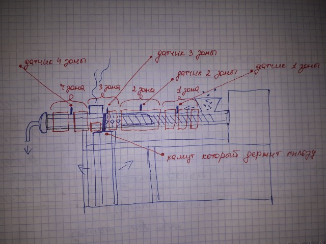 Откалибровал приборы "трм 1". Сейчас идет лучше, но все же присутствуют перерывы, на 1 зоне ставлю температуру 180 С°, на 2 зоне 200С°, на 3 зоне 200С°, и на 4 зоне 200С°, запускаю материал и через какое то время начинает расти температура на 3 зоне вплоть до 300С°, материал идет, но очень сильно начинает пульсировать "то есть материал выходит, останавливливается и потом все хуже и хуже. На 1 зоне "1, 2 тены по 2 квата, 3 тен 3 квата", "2 зона там один тен и он на 9 кват", на 3 зоне 1,5 тена, полный 2 квата, половинка на 1 кват", "4 зона 2 тена по 2 квата". Мне кажется в области где стоит хомут, тепло 3 зоны уходит в основном на корпус т.к. металл очень толстый, на третьем растет температура, при этом смотрю в зону дигозации и там так же сырье, то идет то стоит. Еще в цеху очень холодно, примерно 0С° температура. Может мои выводы не верны?