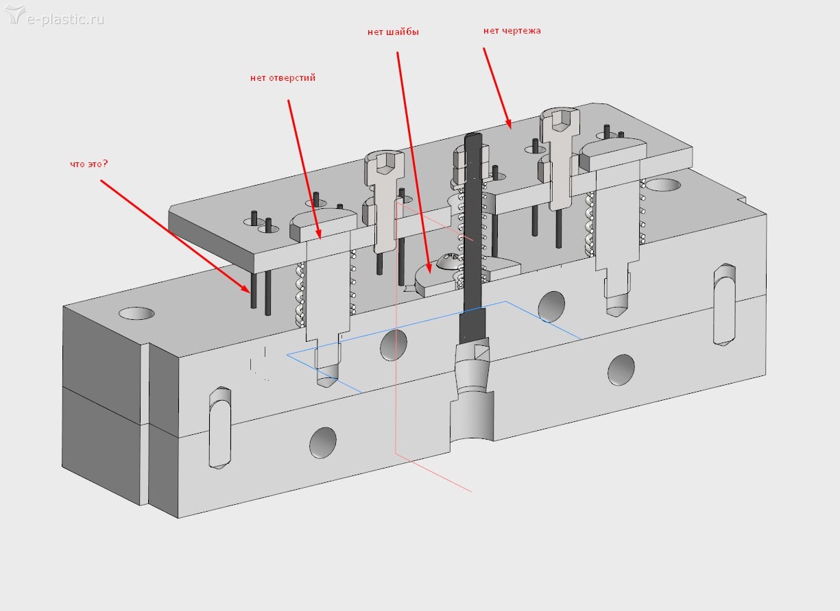 Они сделали только проект или изготовили форму? Если только проект, то попросите их дополнительно к 3D модели выпустить чертежи на все нестандартные детали и сборочный формы со спецификацией. Тогда все вопросы по поводу отсутствующих размеров/отверстий/непонятных деталей отпадут. Сейчас у вас не проект, а "полуфабрикат" извините... Но лично мое скромное мнение - цена такому проекту 3 копейки, вам нужно найти изготовителя формы (который специализируется на формах!) согласного сделать формочку под ваш мини-ТПА. Вы пытаетесь без какого-либо опыта в формах получить чертежи в одном месте, металл купить в другом, изготовить в третьем... зачем???