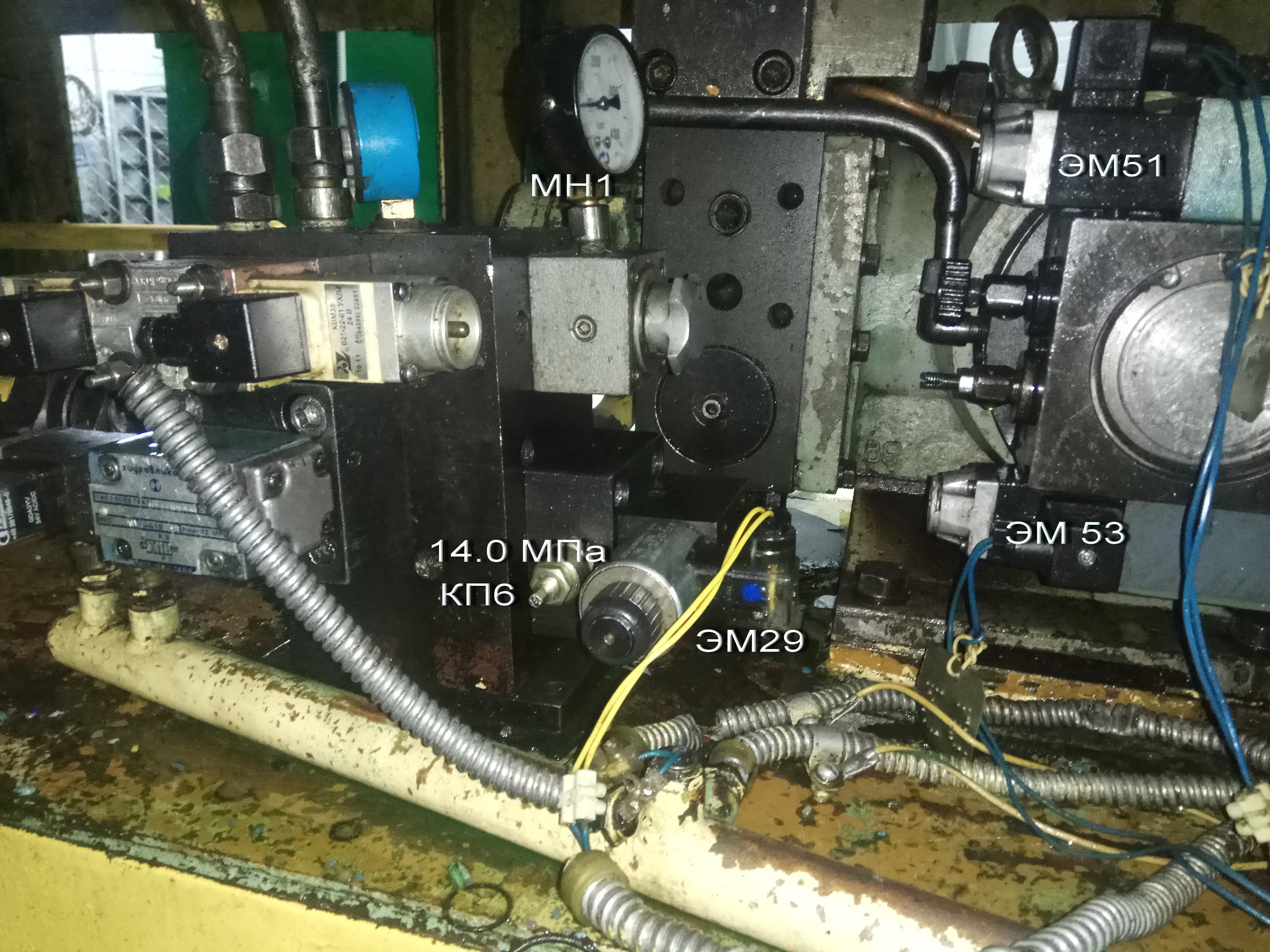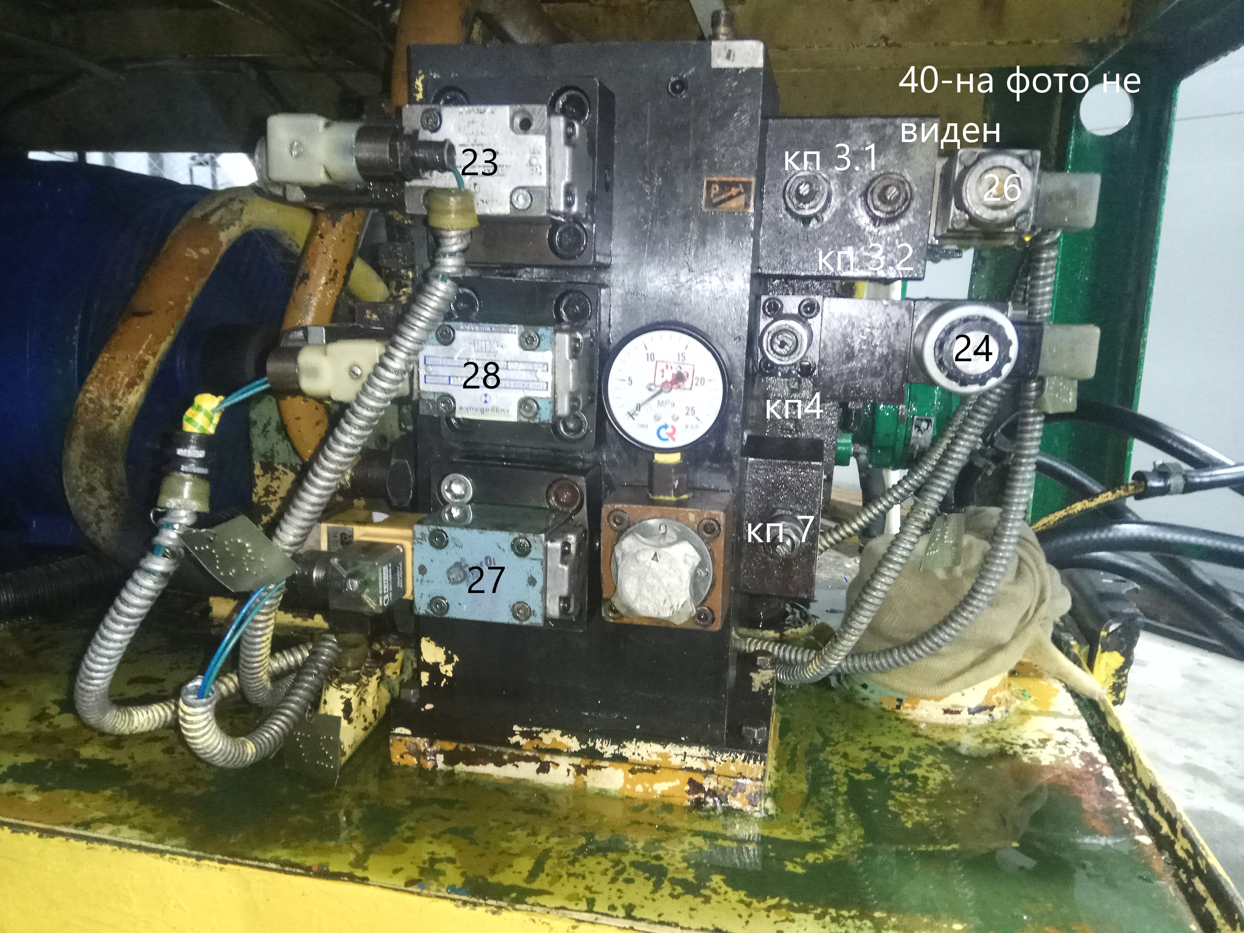 С добрым утром, процесс пошел. Еще одно фото нужно, блок со стороны цилиндра дожима, вид спереди.Или это и есть вид спереди, тогда с боков для наглядности. На большом манометре значение не на нуле? Это растянуло скобу внутри манометра? Или показывает давление управления? И синий манометр рядом в не штатном месте завернут вроде, нужно разобраться для чего. ( возможно контроль прижима сопла). Теперь нужно подписать маркером нумерацию электромагнитов всех. Либо на словах, либо отредактировать фото. Начнем с общего давления насосов. У 29 - разгрузка нагрузка насоса левого Р=14.0 МПа. Ставим переключатель двухпозиционный в нужное положение и нажимаем кратковременно на У29 и любой из магнитов на голове управления левым насосом. И подстраиваем регулировочный винт на значение 14 МПа- 140 атмосфер. Эту процедуру попытаюсь обозначить на отдельном фото. ( не очень это умею) Бегемот в этом мастер. Блоки похожи очень на блоки Одессы 250 и 500. Игорь должен помнить все магниты и даже может отредактировать подписать ваши фото. Я тем временем поищу где то были. Сравним. Не хватает манометров подпора, впрыска, входного давления в гидромотор. Но есть точки, куда потом можно приладить манометр с трубочкой переносной в каждую точку по очереди. Пока начать можно и без них.