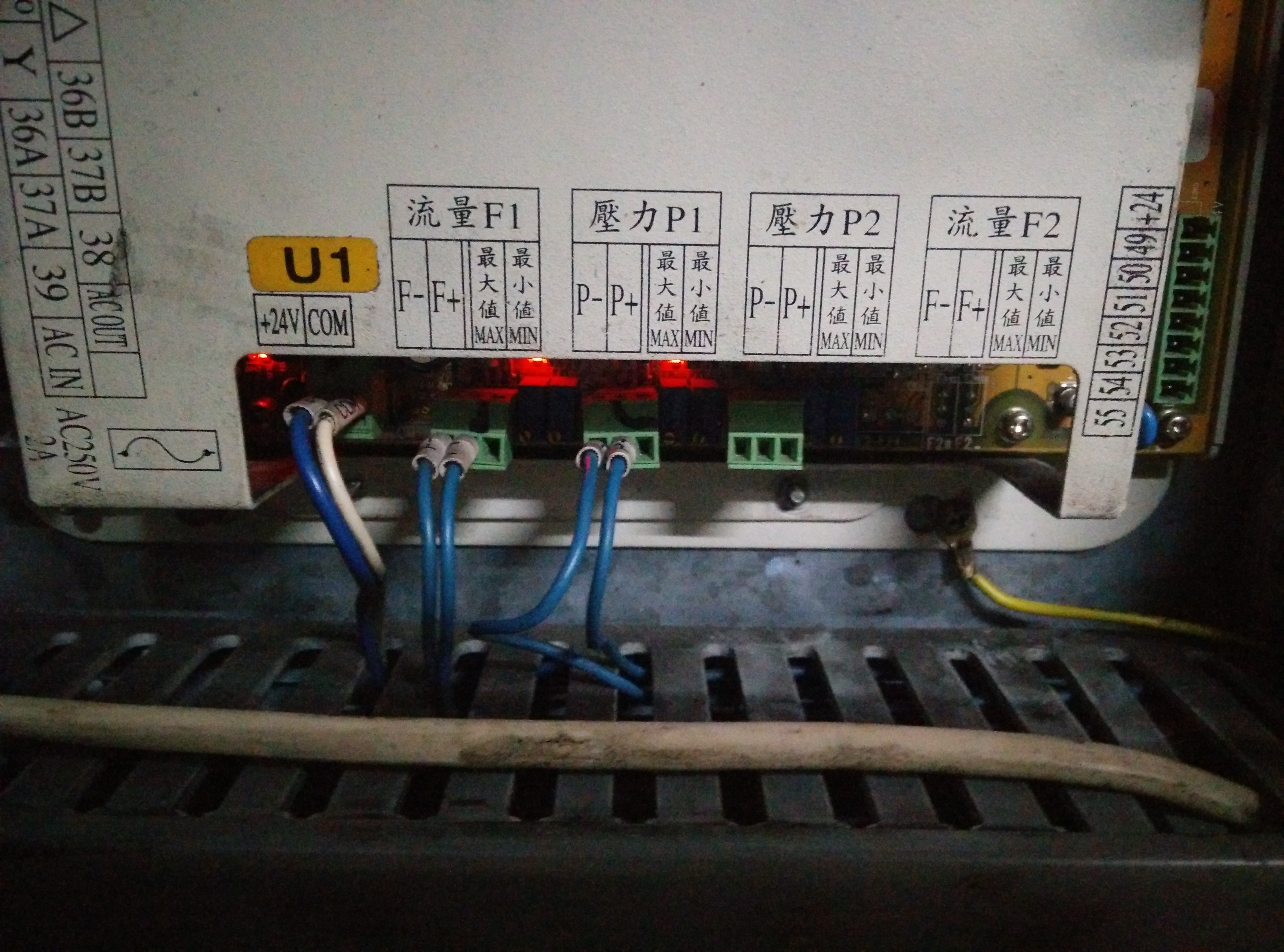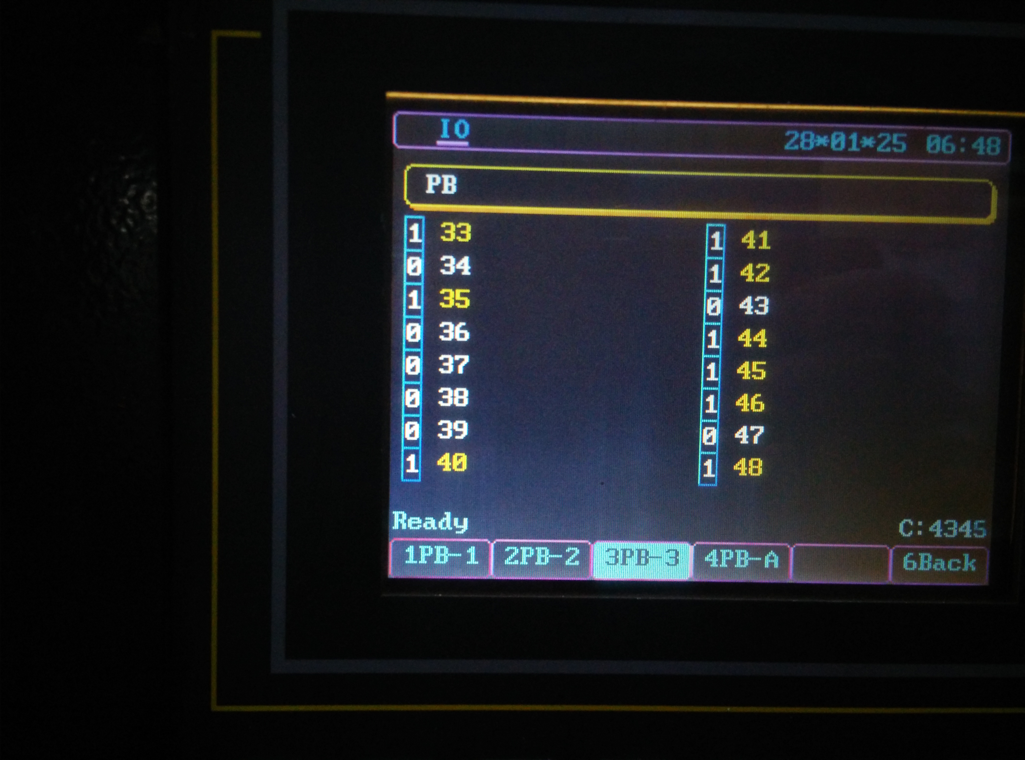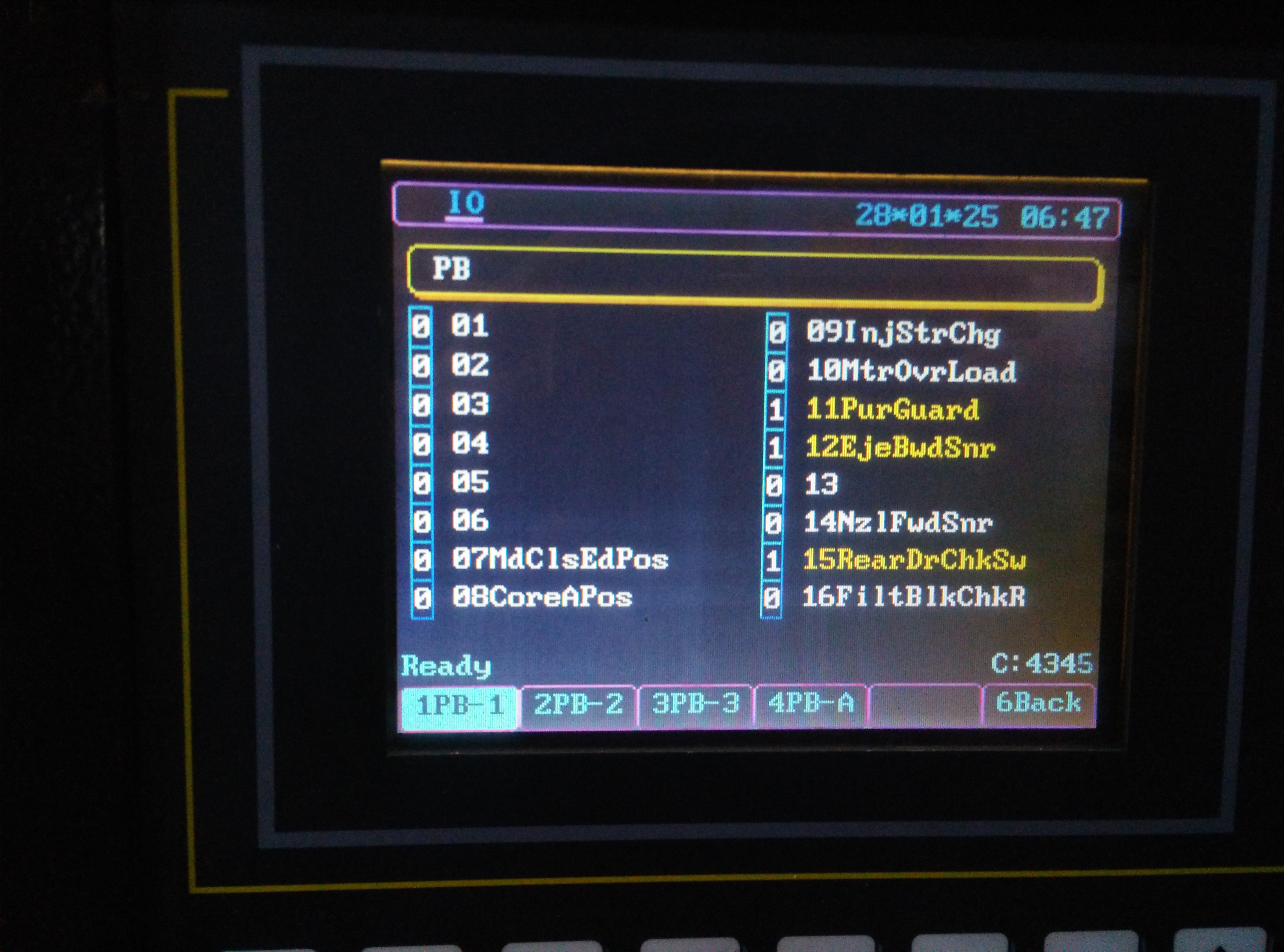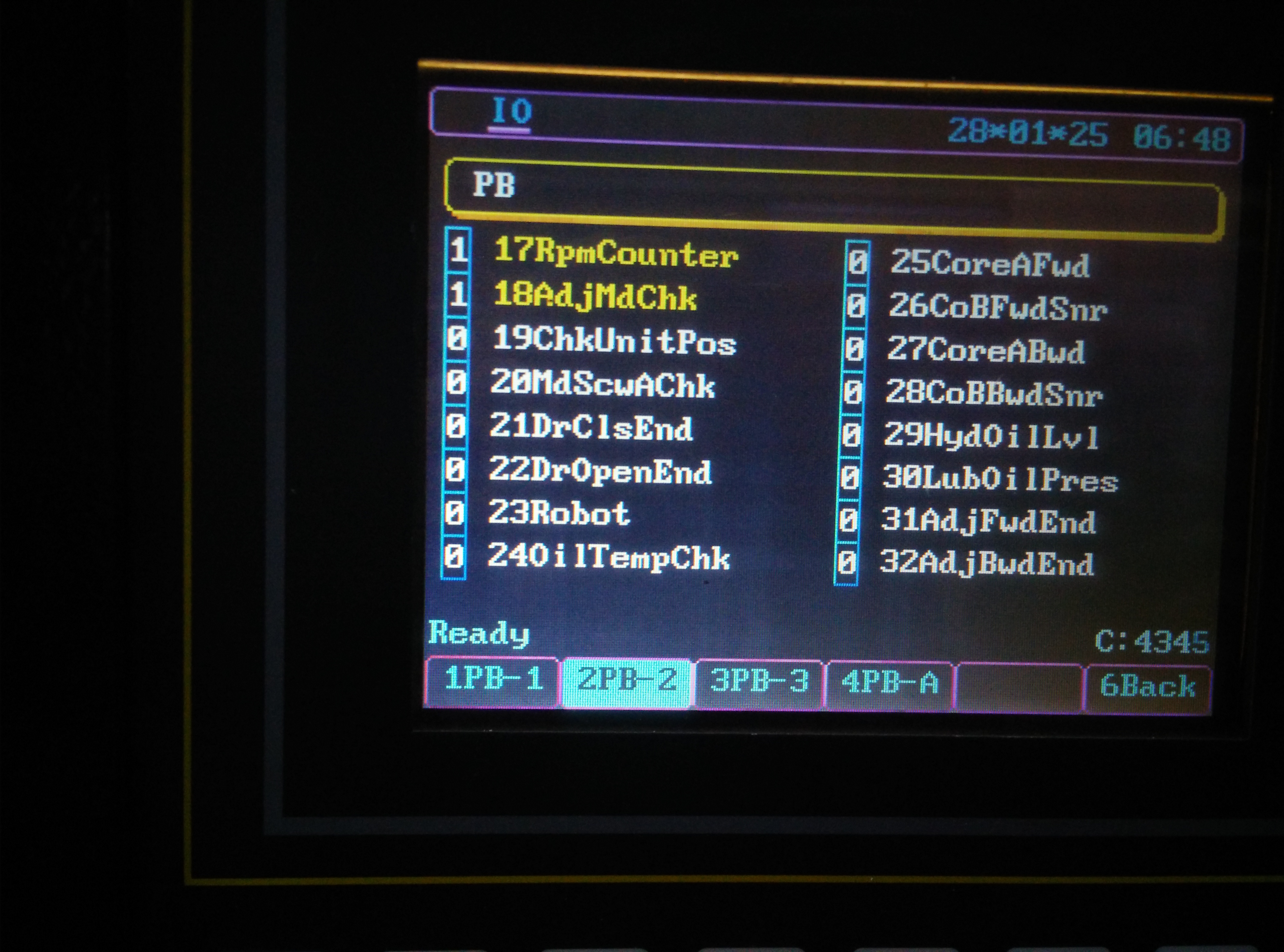 По выложенным фото Входов-Выходов попробую сделать перевод конфигурации, поддержанной программой. На мой взгляд, самый интересный для вас вход - это PB2-19 (Check Unit Position) К этому входу подключаются (если сейчас их нет) рефлекторные фотодатчики определения выпадения изделия из формы (одиночного). Здорово облегчает работу оператора, давая ему возможность обслуживать 2-4 станка. Рекомендую перед подачей в контроллер "расширить" сигнал с фотодатчиков при помощи таймера на 24 В (0,2 - 0,5 с). Это даёт отсутствие ложных тревог контроллера на мелких/тонких/сетчатых изделиях. Ложные тревоги нервируют операторов и малоопытных наладчиков.