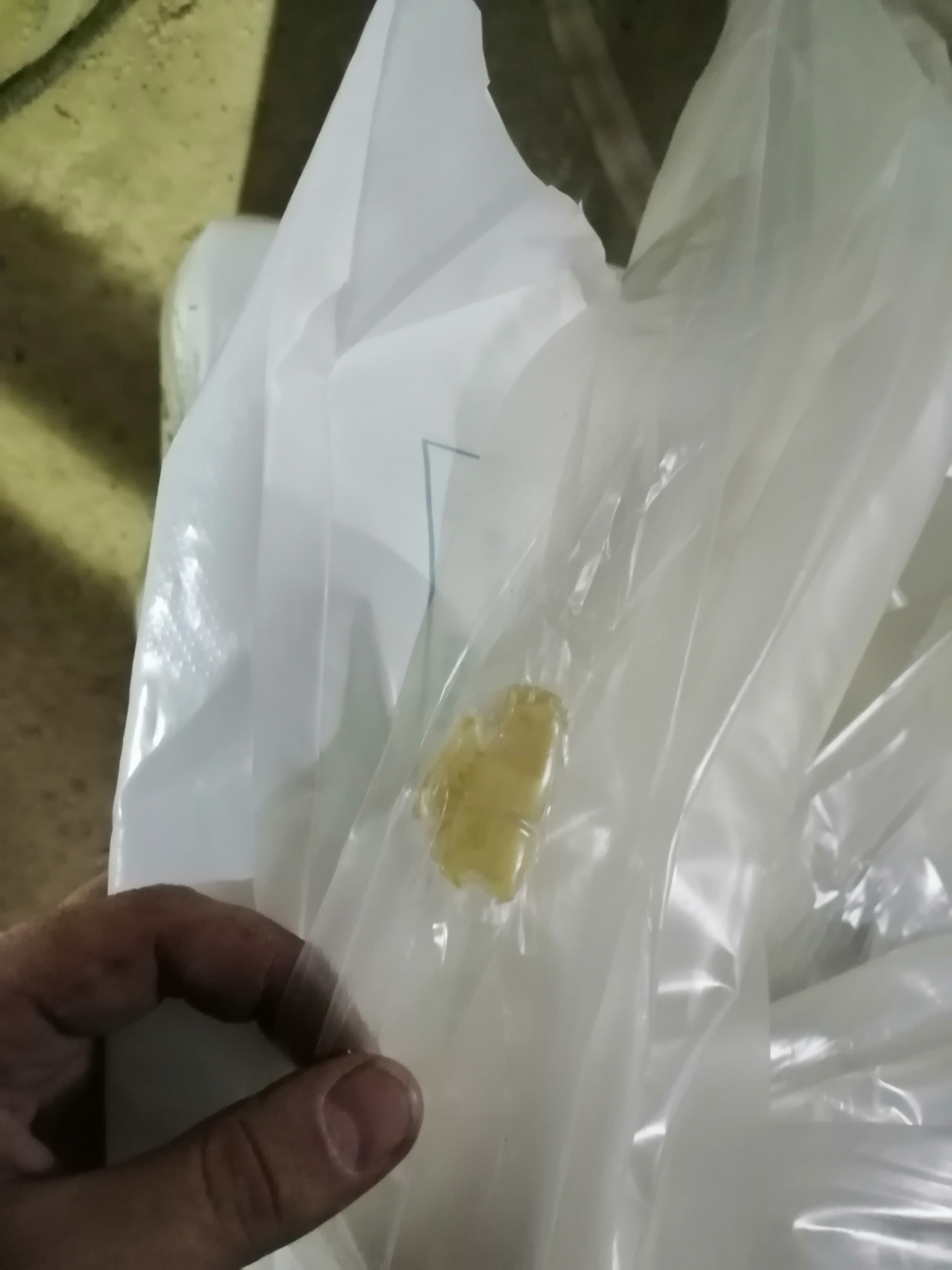Охарактеризуйте какое это пятно на ощупь, вид, цвет, вкус и запах. Режимы, сырье, только на одном экструдере такое происходит?
