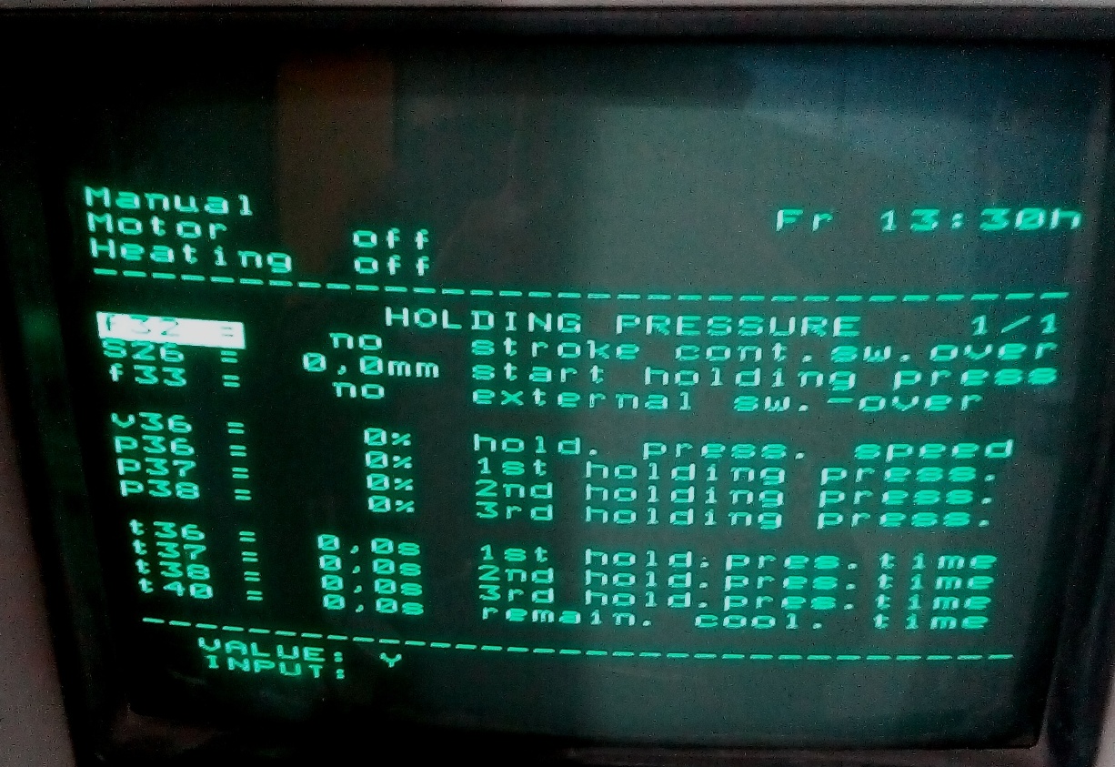 Если по порядку следования фото, то идёт Holding pressure – давление выдержки. Конечно, удобнее было бы набирать программу в порядке следования в цикле: температуры цилиндра, смыкание, подвод узла впрыска, впрыск, давление выдержки, дозирование, отвод узла впрыска, размыкание формы, выталкиватель. Ладно, для примера сойдёт.