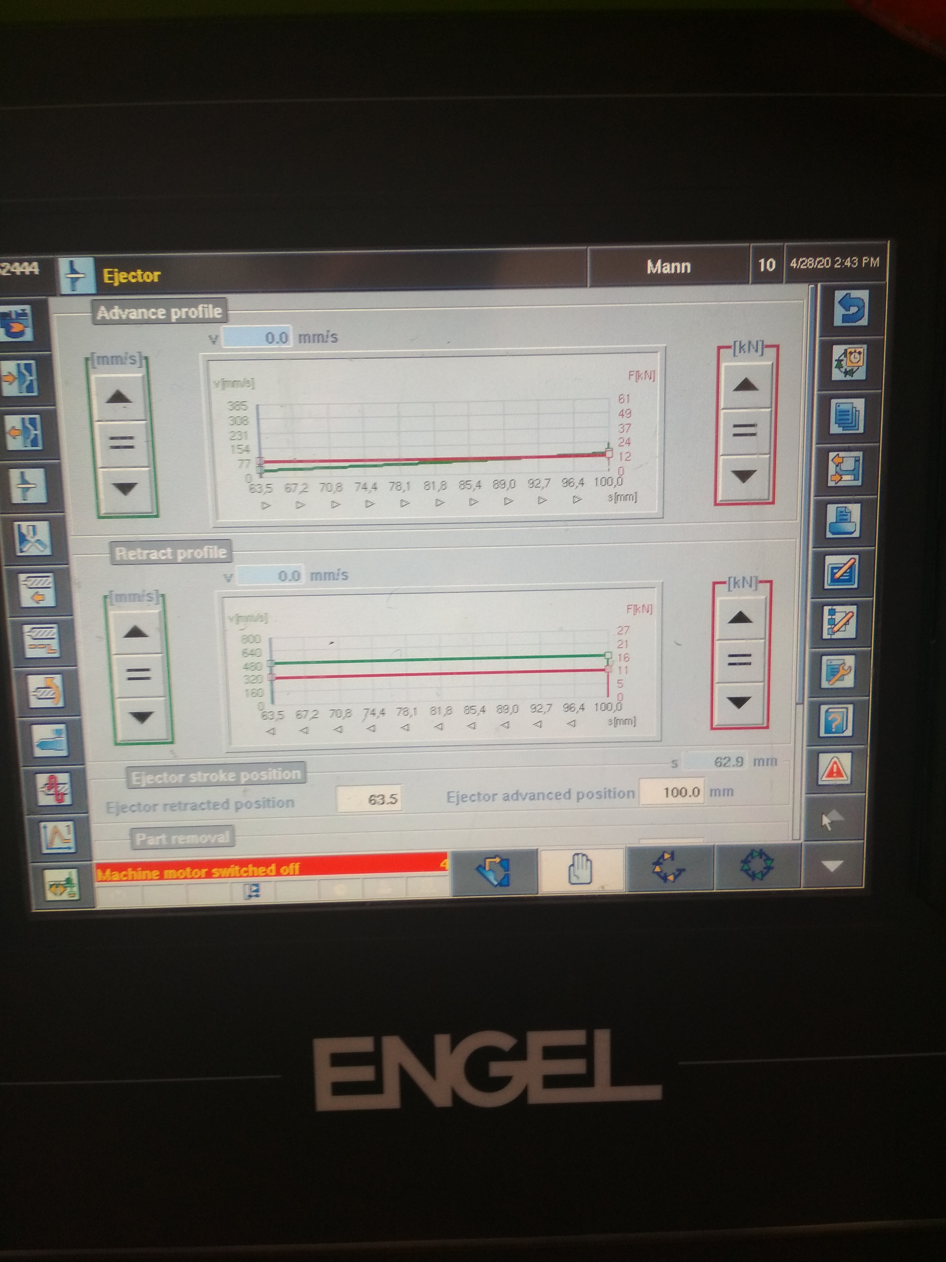 Обрати внимание на нижние: ejector advanced (выдвинут) и ejector retracted (втянут). Ноль пути толкателя начинается во втянутом положении и он там должен находиться, пока форма не придет в точку open (открыта). При открытой форме можно начинать выталкивание, для этого в параметр ejector advanced заносишь необходимую длину выбега толкателя. У тебя сейчас одинаковые значения, а это нонсенс. Поставь значение втянутого толкателя 2...4 мм для уверенной фиксации.