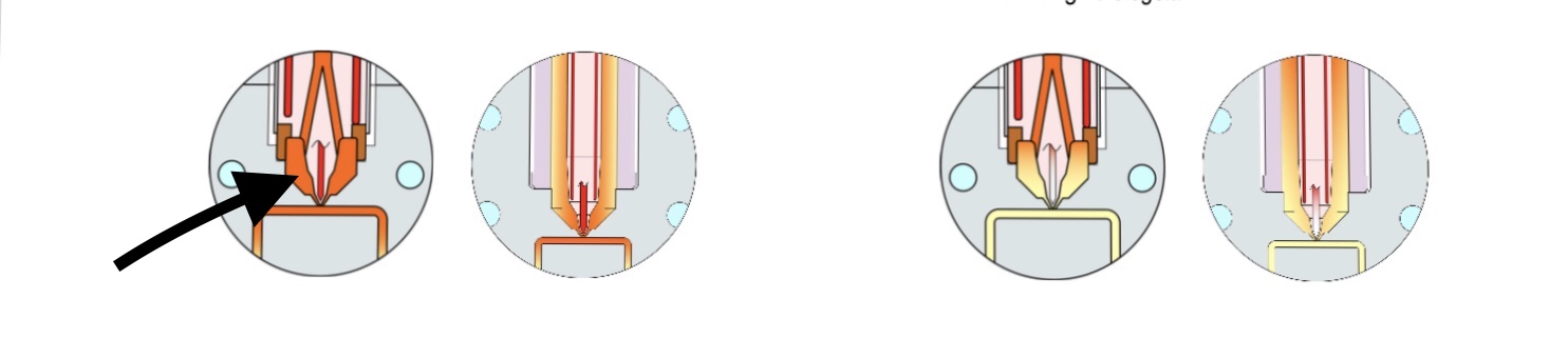 И так , пробовали снизить температуру до 200 на ГС - не помогло , снижали температуру шнека , тоже нет . Уменьшили время выдержки до 0 , тоже самое .... Может дело в другом . В самом конце сопла есть задвижка , на ней надписи декомпрессии и инкомпрессия , какую роль она выполняет ?