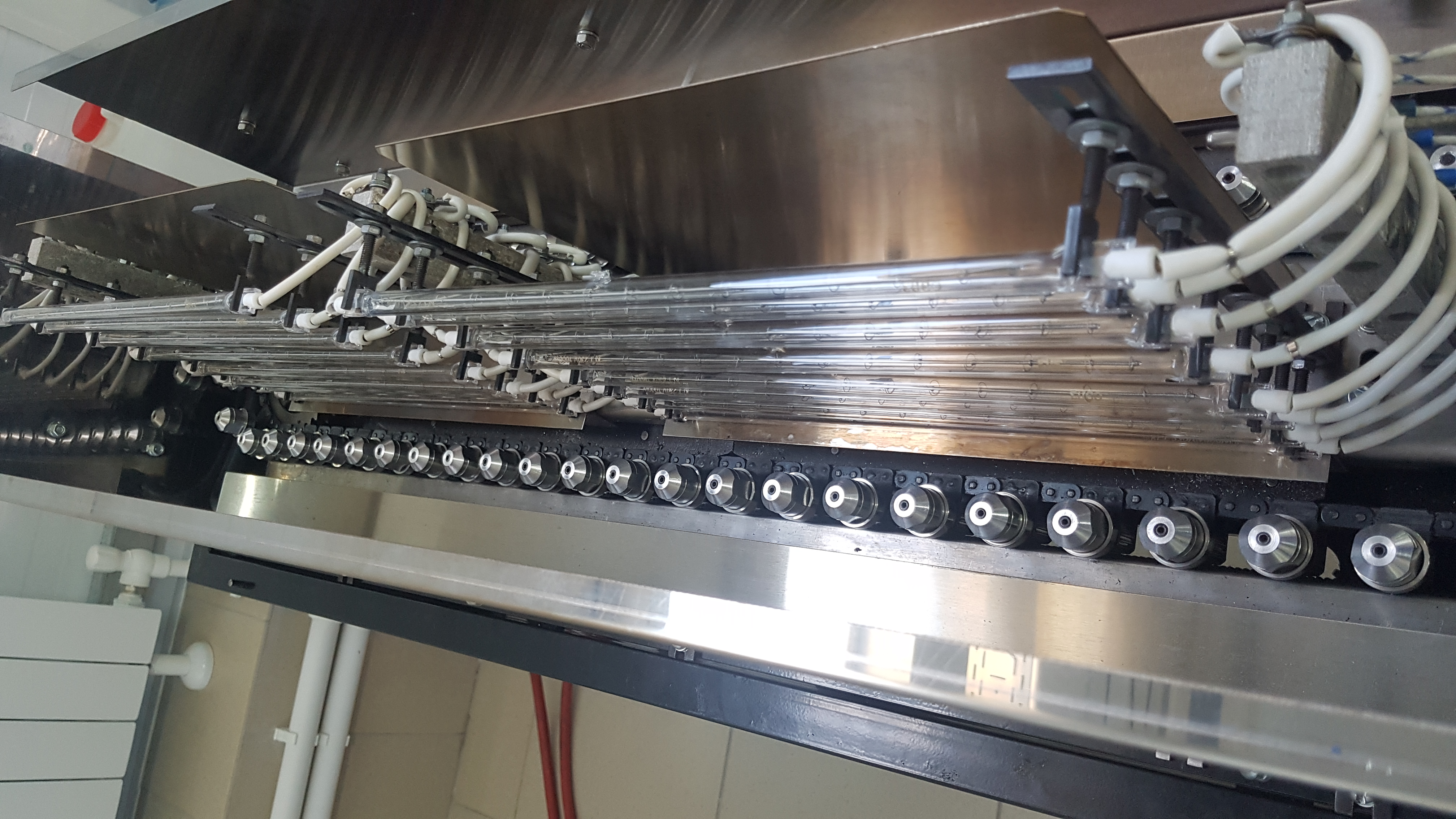 Подожди, Сейран, если я правильно понял 2 ряда по 8 ламп стоят посередине печки? С правой стороны ламп стоят отражатели? То есть, когда преформа идет В печку - она греется лампами, а когда ИЗ печки - лампы закрыты отражателями и преформа не греется?