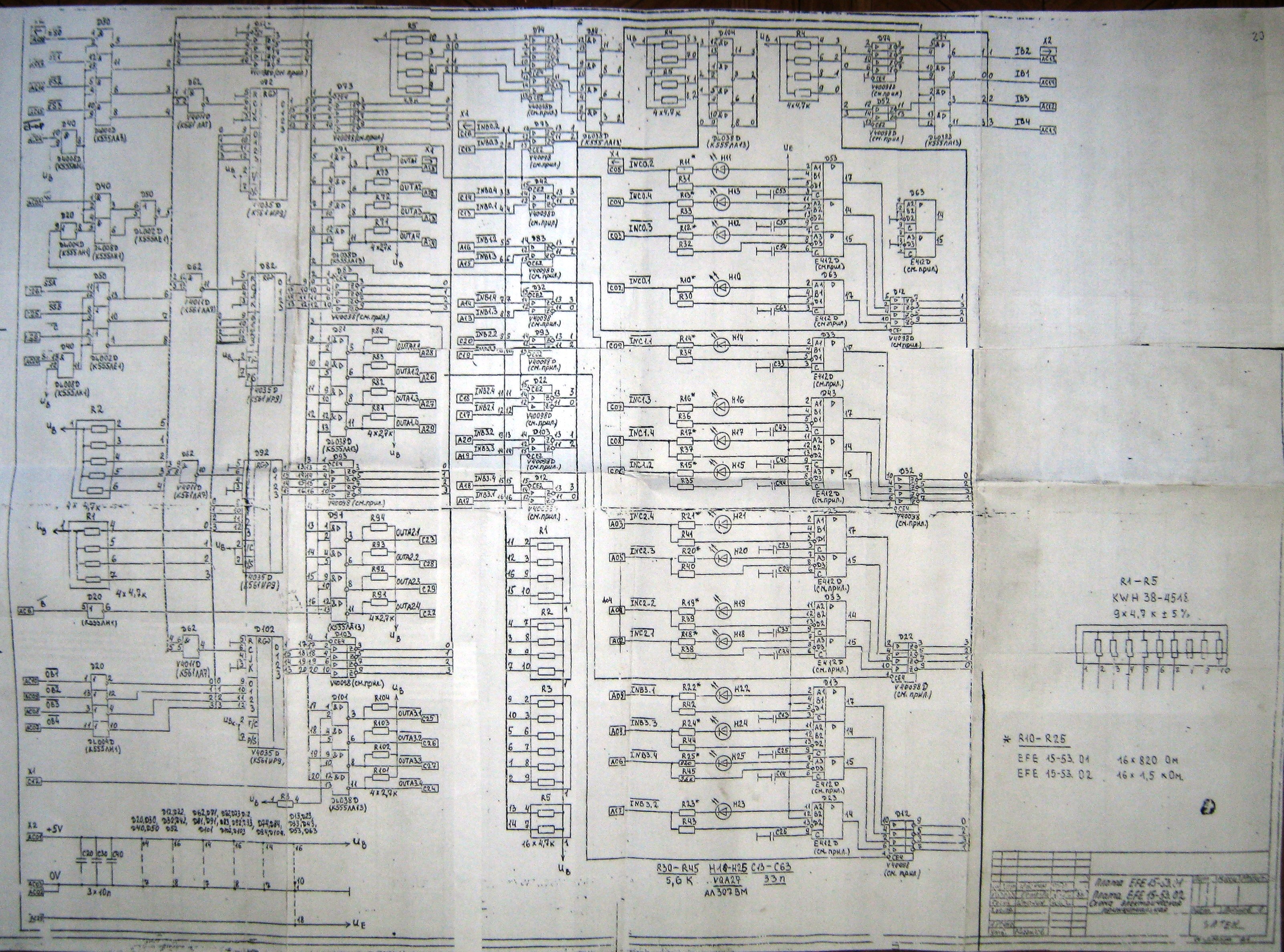 Очень тронуты вниманием к нашей проблеме - - спасибо. ЧИЖ немного неправильно нас процитирол есть два станка 105 в комплектации с одной платой входов EFE 15-51 один удалось довести до кондиции работы в наладке и ручном режиме.,автомат и полуавтомат не удалось вытянуть по каким причинам не знаю а вот второй 105 действительно полумертвый только пресс форма работает и то в наладке с последним не рабочим станком вообще был акт отчаяния просматривали и сравнивали осциллографом на корзинах обоих станков входные сигналы на штекерах входных плат в одинаковых режимах и идентично расставлеными концевиками оказалось что входные сигналы абсолютно одинаковые для обоих станков.И мы думали что не рабочему станку не хватает какого то входного сигнала и следовательно блокировка.Поэтому работа с усилителями выходных сигналов в тч и функциональная схема действительно сейчас актуально, но жестокий цейтнот и раздергивание в цехе пока не позволяли сосредоточиться и довести эту работу до конца.Виноваты. Что касается количество входных плат то станки так долго простаивали что никто и не помнит сколько там плат было даже сейчас при одном частично работающем станке(не работает полу и автомат) говорят что плат не хватает(из за автомата и полуавтомата)
