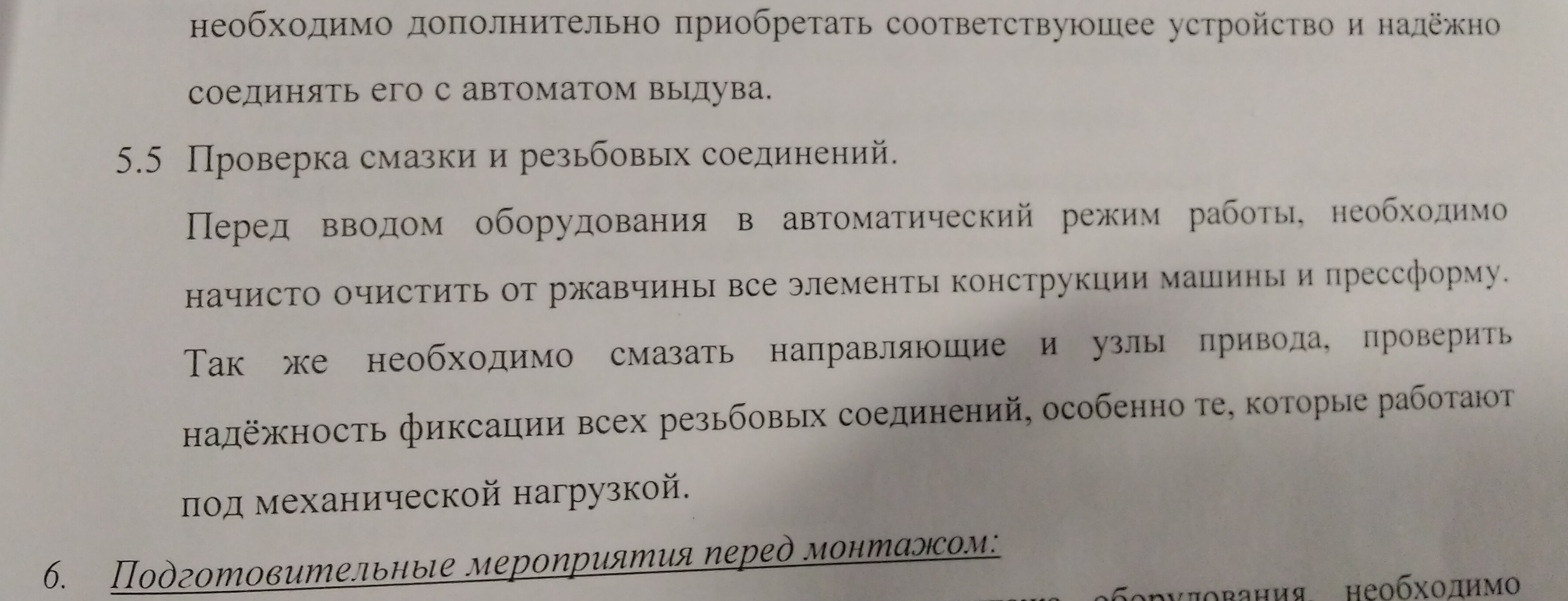 Несколько недель назад приглашали настроить выдув бутылок на полуавтомате. К сожалению, из запрошенного веса (22 гр) выдуть литровую бутылку на предложенном полуавтомате не удалось из-за конструктивных особенностей - отсутствие превыдува (к дооснащению п/а предвыдувом заказчик не готов по финансовым соображениям).