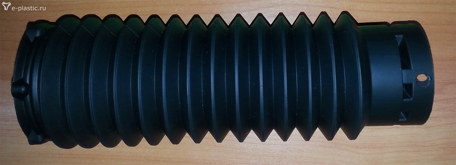 Посмотрите во вложении пример изделия - автомобильный чехол для амортизаторов. Он производится экструзионно-выдувным формованием из таких термоэластопластов как Santonprene, Kopel KP3855FB, Kopel KP3943BМ. Что касается первого было лень искать, но второй материал имеет модуль упругости 290.