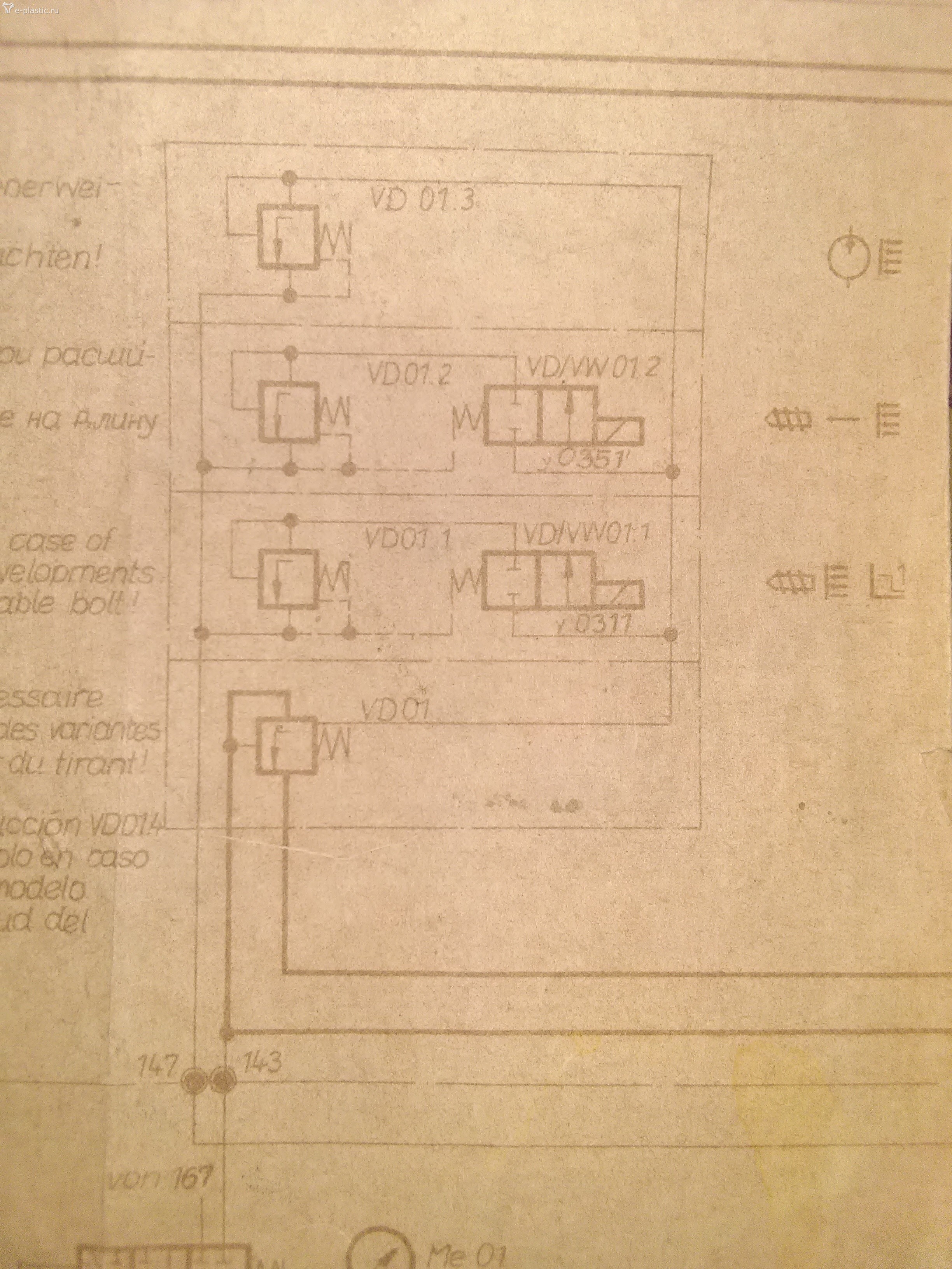 Пост#70. Эх ёлок навалено , только держись.... Поворачивать к черту не будем. Тут по сути три сосны. Даже не знаю как разрулить. Схему на стол и за работу. Кончаем сумбур. Называем железки по именам и номерным обозначениям. Весь блок называется Предохранительный клапан не прямого действия на три регулируемых давления с электро управлением. На защите инструмента тоже самое но на два регулируемых давления. По поводу задниц ( звучит более интелигентно) они родные и в них чаще всего есть отверстия для принудительного ручного нажатия включения. Посылал фото устройства. Бывают нормально закрытые и нормально открытые. На VD 01 нормально закрытые , что позволяет настраивать общее главное основное давление в системе до требуемого. Не зависимо от двух других впрысковые, так как они в исходном положении нормально закрыты и масло не попадает под иглы их настроек. Иглы настоек все одинаковые и являются предохранительными клапанами прямого действия или клапанами предварительного давления. В чем различие прямого действия от не прямого в открытом доступе полно информации. ( подучится надо). Далее...