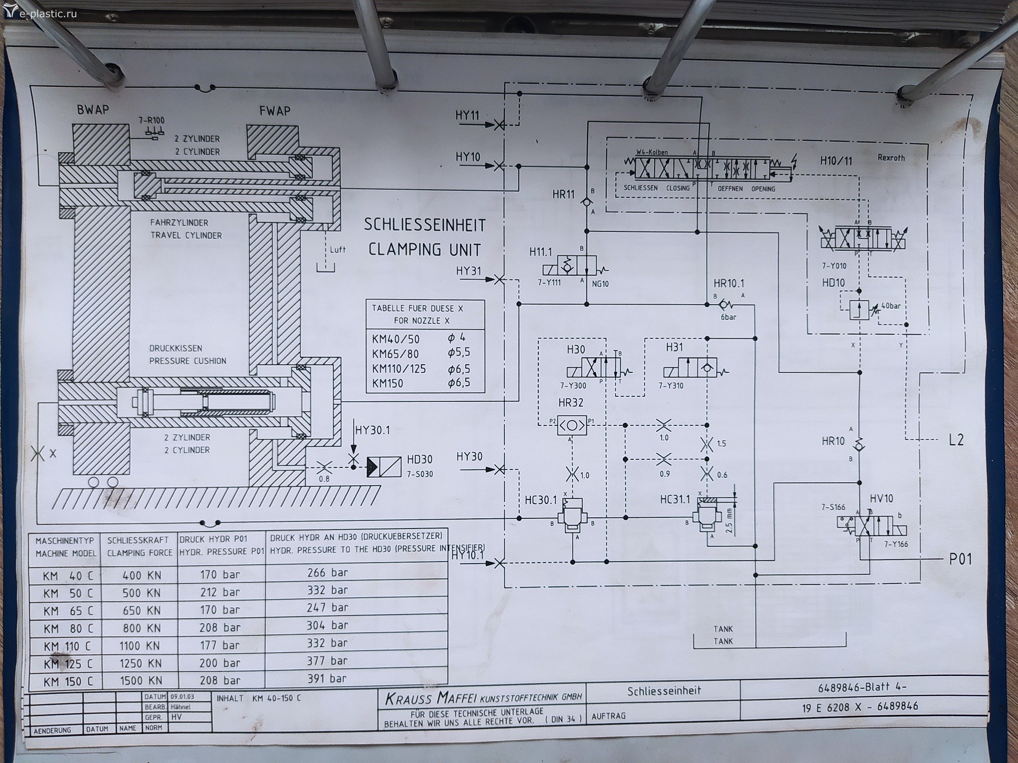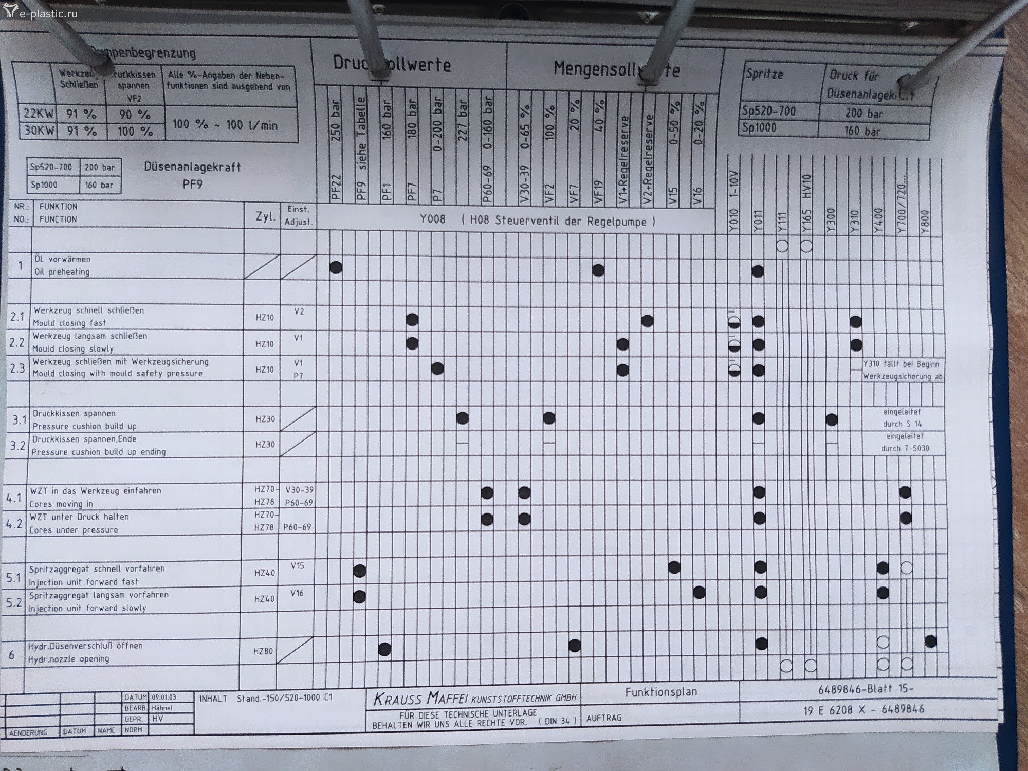 При смыкании формы набирает, но не держит заданное давление. Давление начинает падать сразу после достижения установленного значения. Если выразить это все в цифрах то, при достижении заданного давления в 1500 кН начинается впрыск и в течении самого впрыска, пластификации и времени охлаждения происходит снижение значения до примерно 30 -40 Кн.
