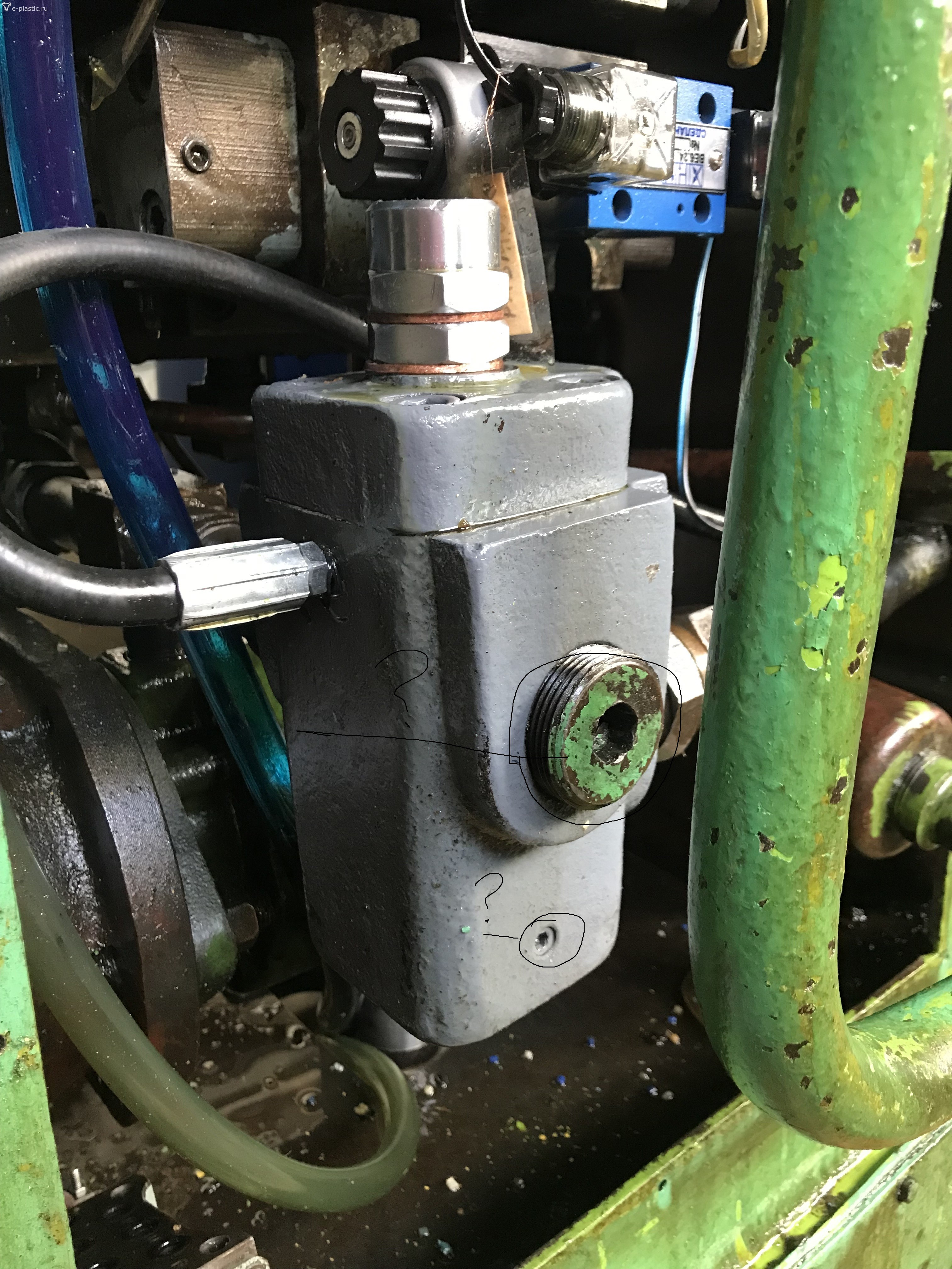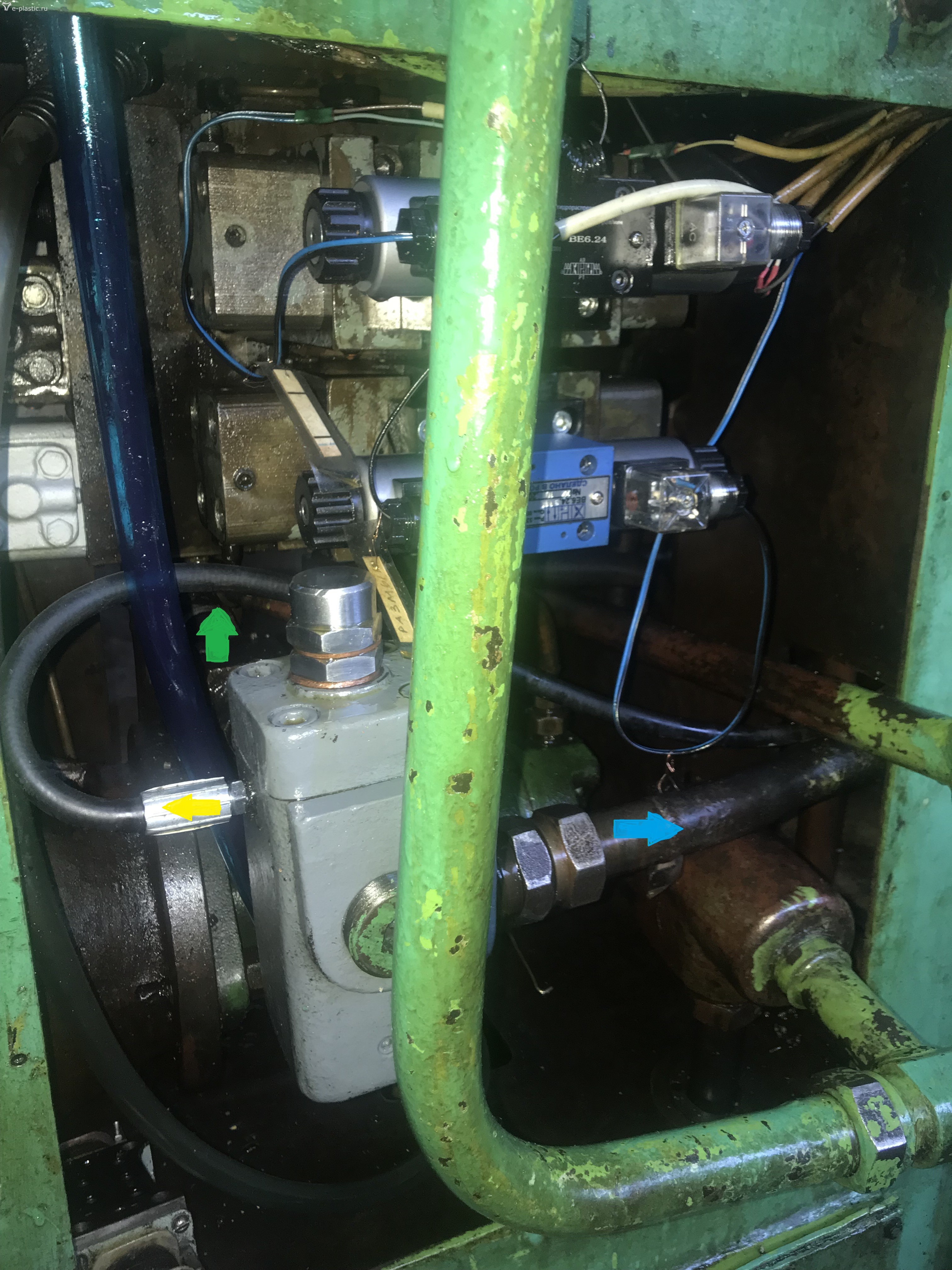 Заглушка напротив жёлтого, это заглушка сливной канал. Технологическая. Сливная магистраль внутри корпуса клапана в основной слив и в бак. На счёт синей не понятно. На схеме после фильтра прямая дорога в бак. Эта синяя случаем не сливная в бак. На фото жалко нашего клапана не видно. Моё мнение Синяя стрелка это слив в бак , и слив в этуже трубу со смыкания размыкания. А жёлтый видно идёт к переходной плите э/м 6 и из него блока видна медная латунная трубка в синюю сливную трубу.