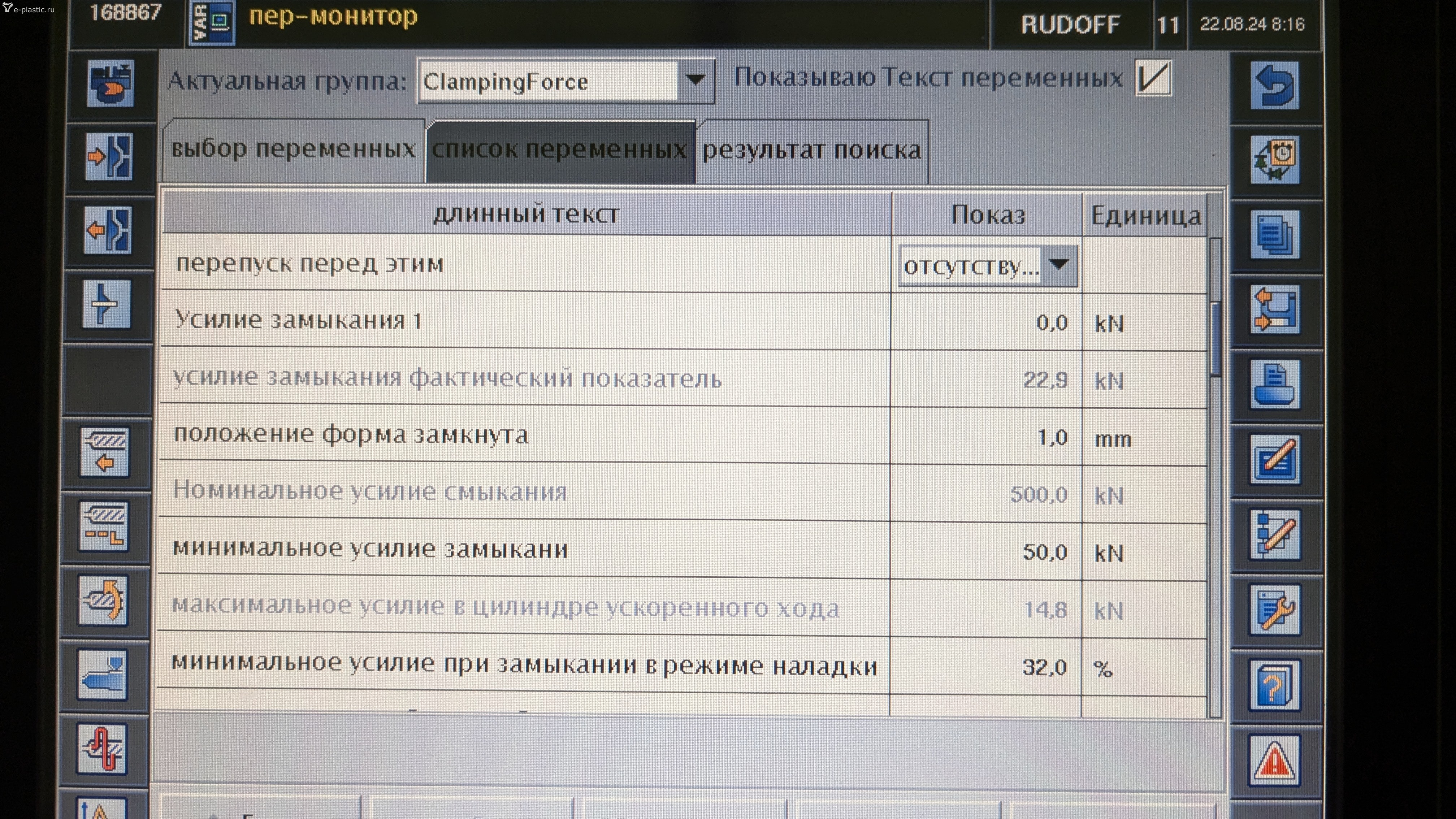 Интересно, а как там у вас последовательность выглядит ? Здесь вы можете вписывать нужные движения. Допустим, если здесь не активируете многоразовый ход выталкивателя , на маске его просто не будет . Это просто один из примеров. Ткнёте в закрытие формы , вылезет окно с силой сжатия. Если сжатие не отображается, зайдите на вариабле и измените с нет, на да . И посмотрите снова. Последовательность меняется с помощью Teach.