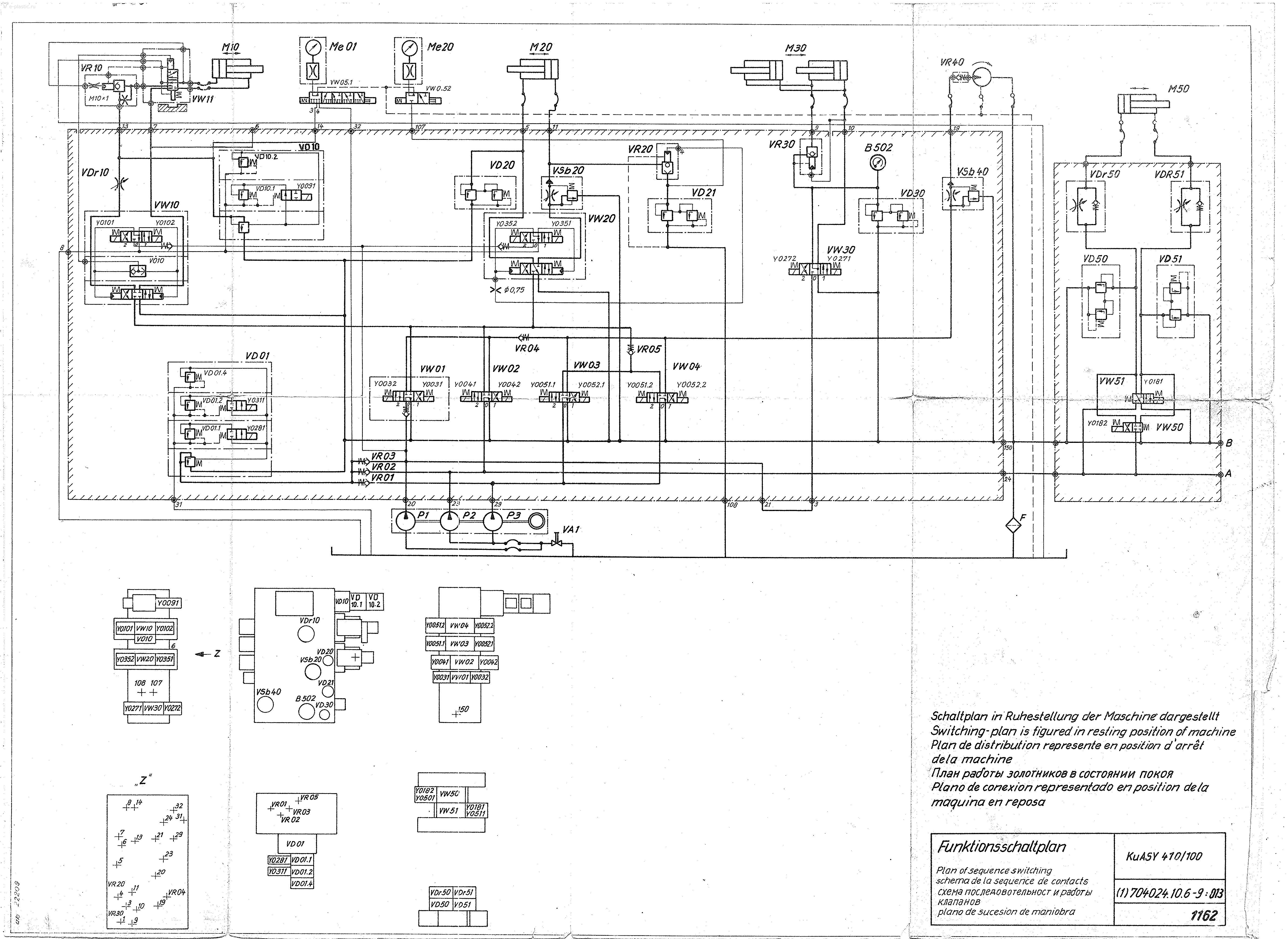 Попробовал порегулировать VD21.регулировка есть .результата нет.Как я понял давление впрыска куда то уходит.За это отвечать могут Vr20 VSB 20 VW20. Управление VR20 поменял,результата нет.VD20 проверил.Слив давления до него идет.Насос и на загрузку и на впрыск один.Его тоже отсекаем.Давление управления на все операции одно.Все кроме впрыска работает.Тоже не оно.Остался только большой клапан.На моей памяти не один не сломался.Не знаю что дальше делать