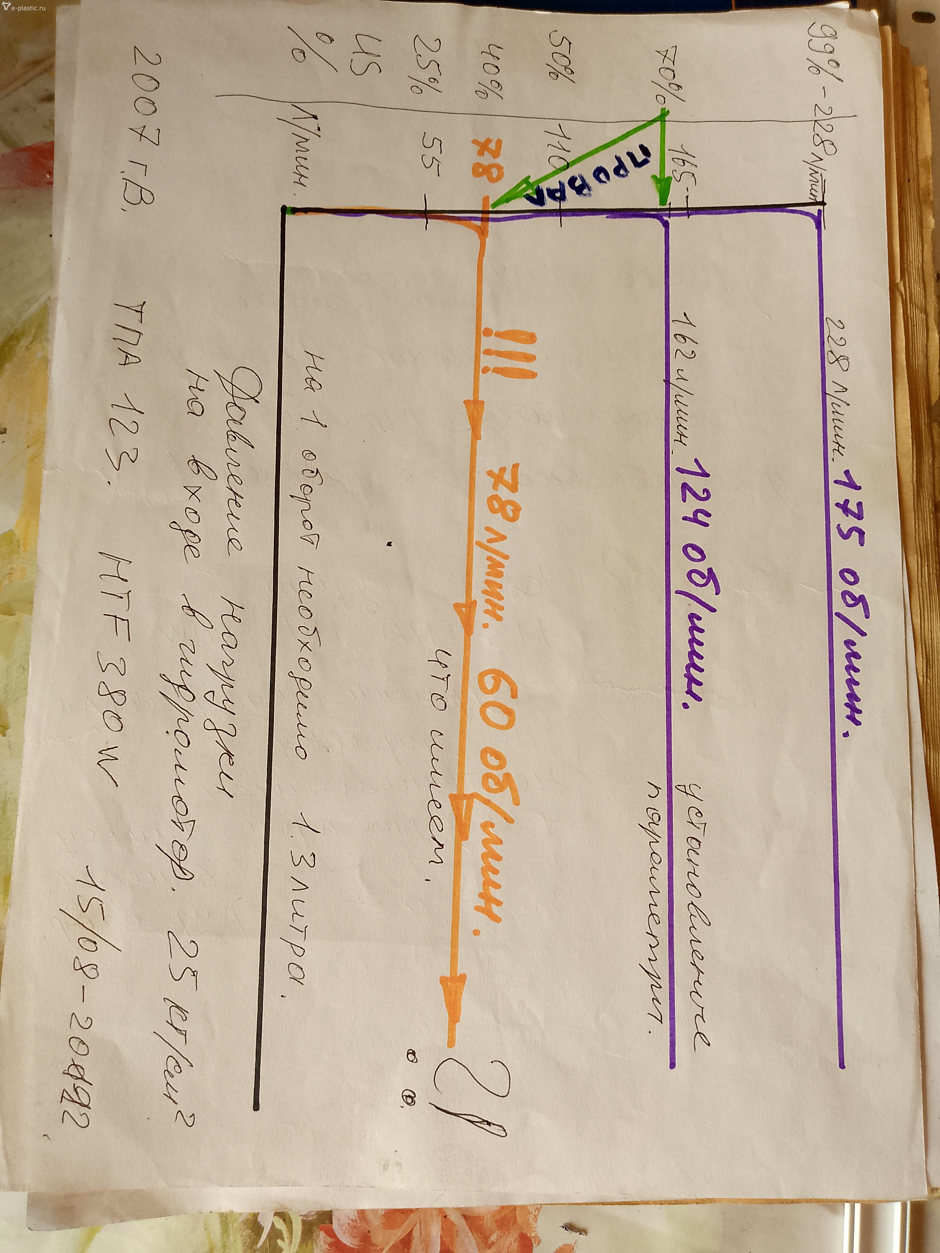 Тестировать удобно по оборотам шнека как меняется поток. Хорошо иметь тахометр. Наши сампальные графики при некоторых разборках ремонтах. Поток в литрах можно посчитать. На шильдике гидромотора объем камеры в см куб. На оборот. Умножаем на число оборотов и отслеживаем динамику.