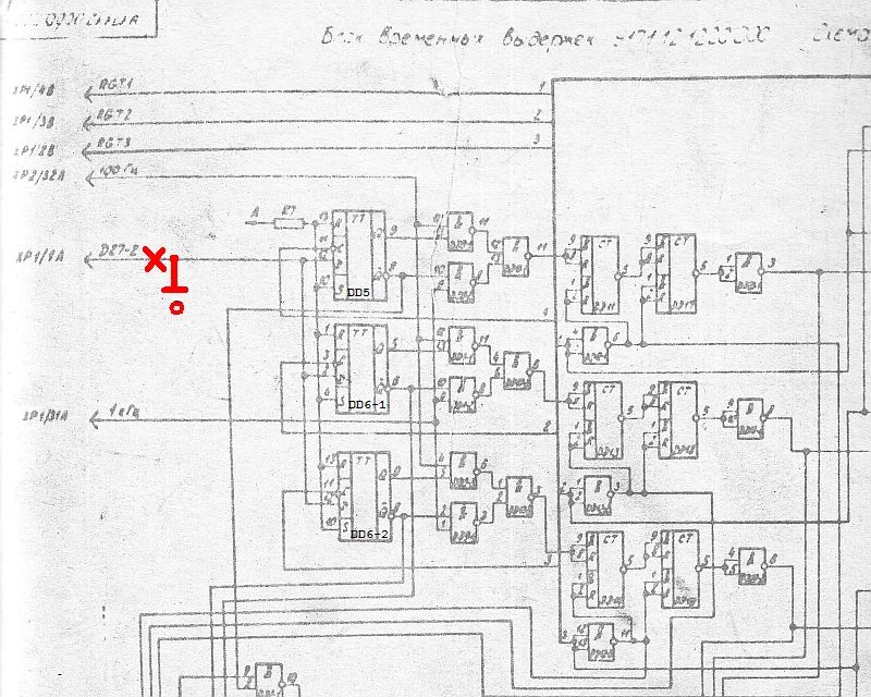 Сигналом 1 или 0 со входа D27-2 триггеры переключают прохождение на счётчики тактовой частоты 100 гц или 1 кгц. Соответственно меняется дискретность задатчика контроля времени впрыска на 0.1 сек, время выдержек под давлением, паузы между циклом, охлаждения и др. переключаются на 1 сек. Если этот сигнал завесить на 0, тогда на всех задатчиках будет дискретность 0.1 сек, как на куасях.