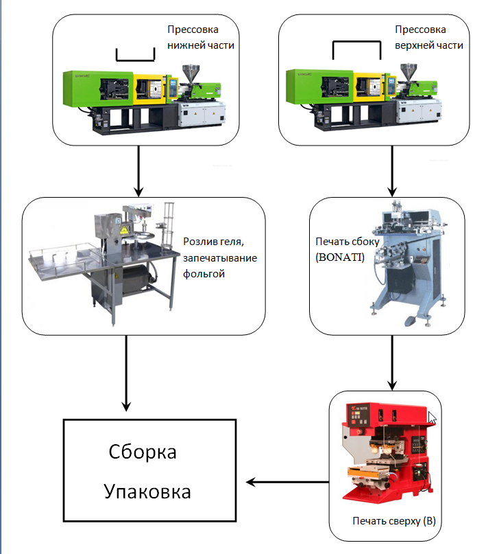 Конструкция не сложная , по типу колпачка , нижний цилиндр смотрит вверх - туда заливается гель , а сверху запечатывается по типу банок кофе , далее сверху закрывается вторым цилиндром , уже лицевым (как колпачком) , на который должна будет нанесена уже печать (логотип , название и т.д)