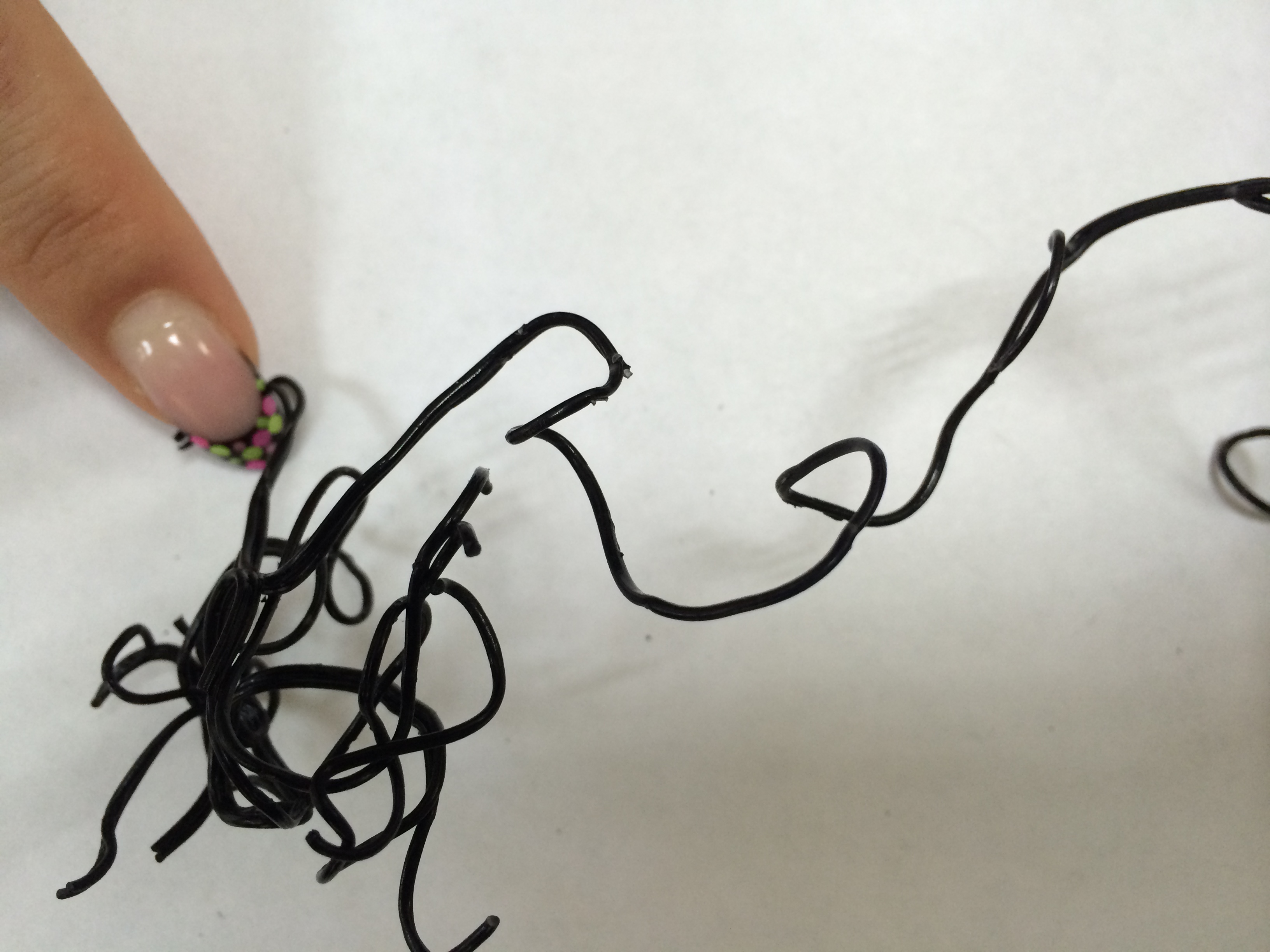 думаю какая то крошка полимерная, должна расплавляться и под давлением выходить из металлического наконечника в виде "нити" , вращением руки мастер будет создавать неровные кольца, чтобы они накладывались в хаотичном порядке друг на друга на сетчатую поверхность, далее мастер пока материал еще мягкий формирует его по поверхности (надавливанием на поверхность в перчатках). в некоторых местах "проволока" будет слипаться это даже хорошо.