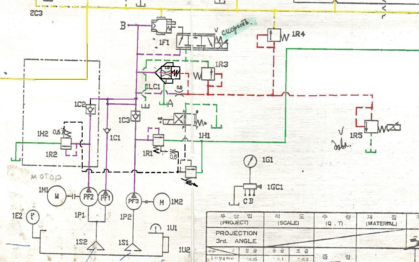 2. 1R4 изображен правильно и тогда он служит как защитный клапан для защиты 1F1 и трубопроводов от выбросов давления при резком, по тем или иным причинам, торможении цилиндров или гидромотора и тогда должен настраиваться на давление (140 +10...15%) бар.