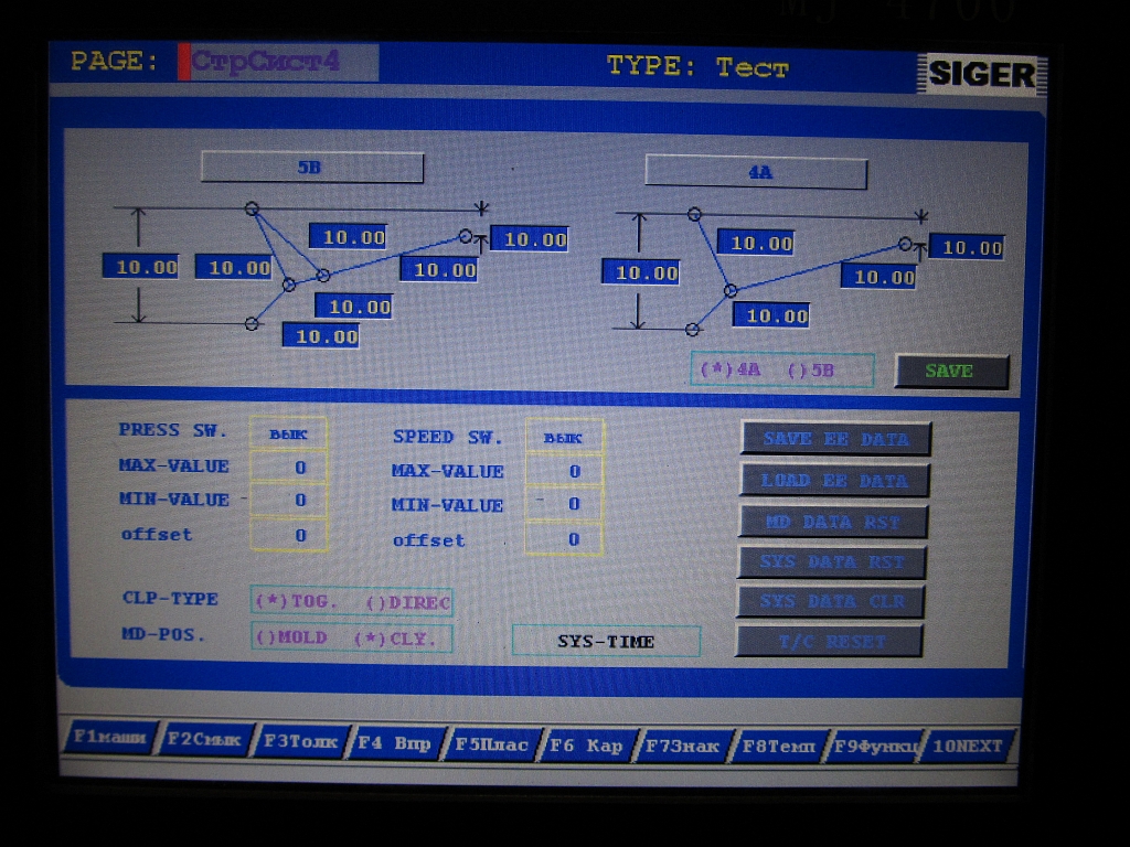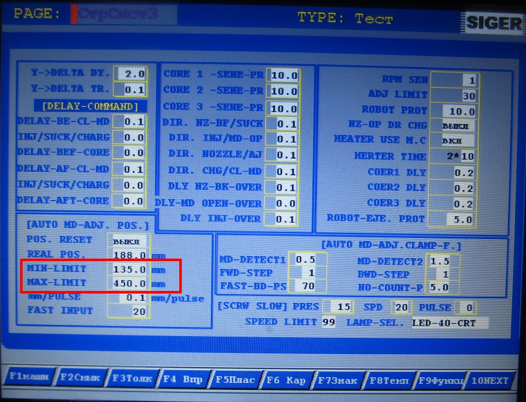 Черт знает. Пытались записать программу в память при этом машина отключилась полностью. После этого слетели многие настройки в том числе и системные (как потом оказалось). Так например минимальная высота прессформы в системных настройках была 45 мм, не было ходов закрытия и открытия ПФ. При нажатии соответствующих кнопок на дисплее скорость и давление оставались по 0.