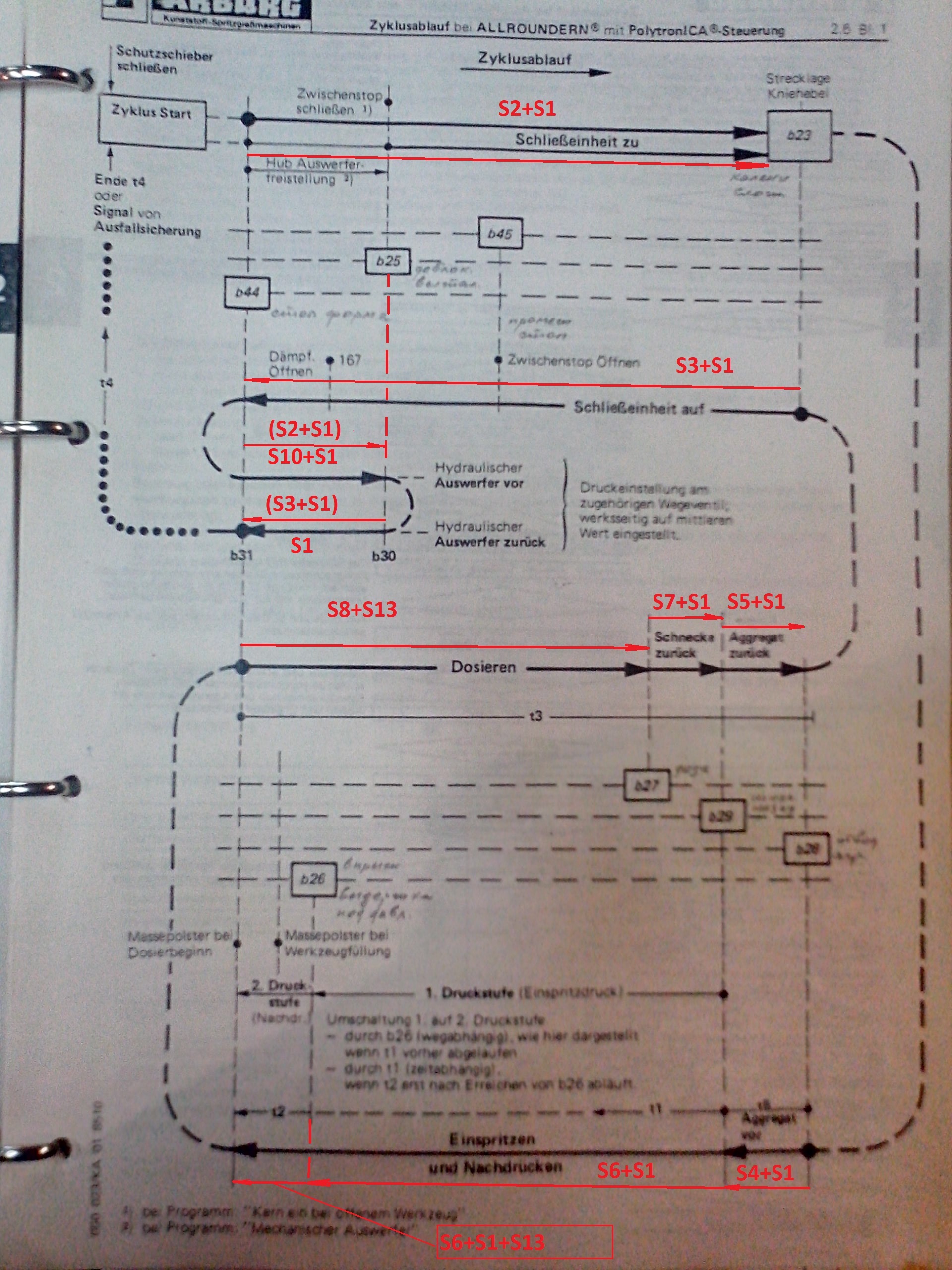 У меня тоже есть эта машина с 1976 года (Alrounder 221E / 150R). Машину я купил как лом и изменил оригинальную электронику на PLC. Tолько контроль температуры оригиналная, потому что я получил заменнуе модулу «термoниц». Cейчас я программирую и хочу спросить: