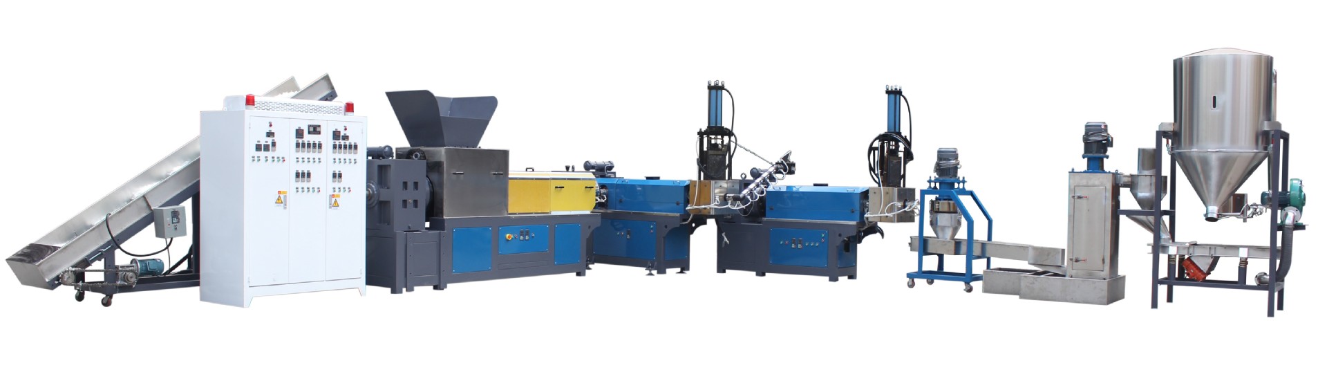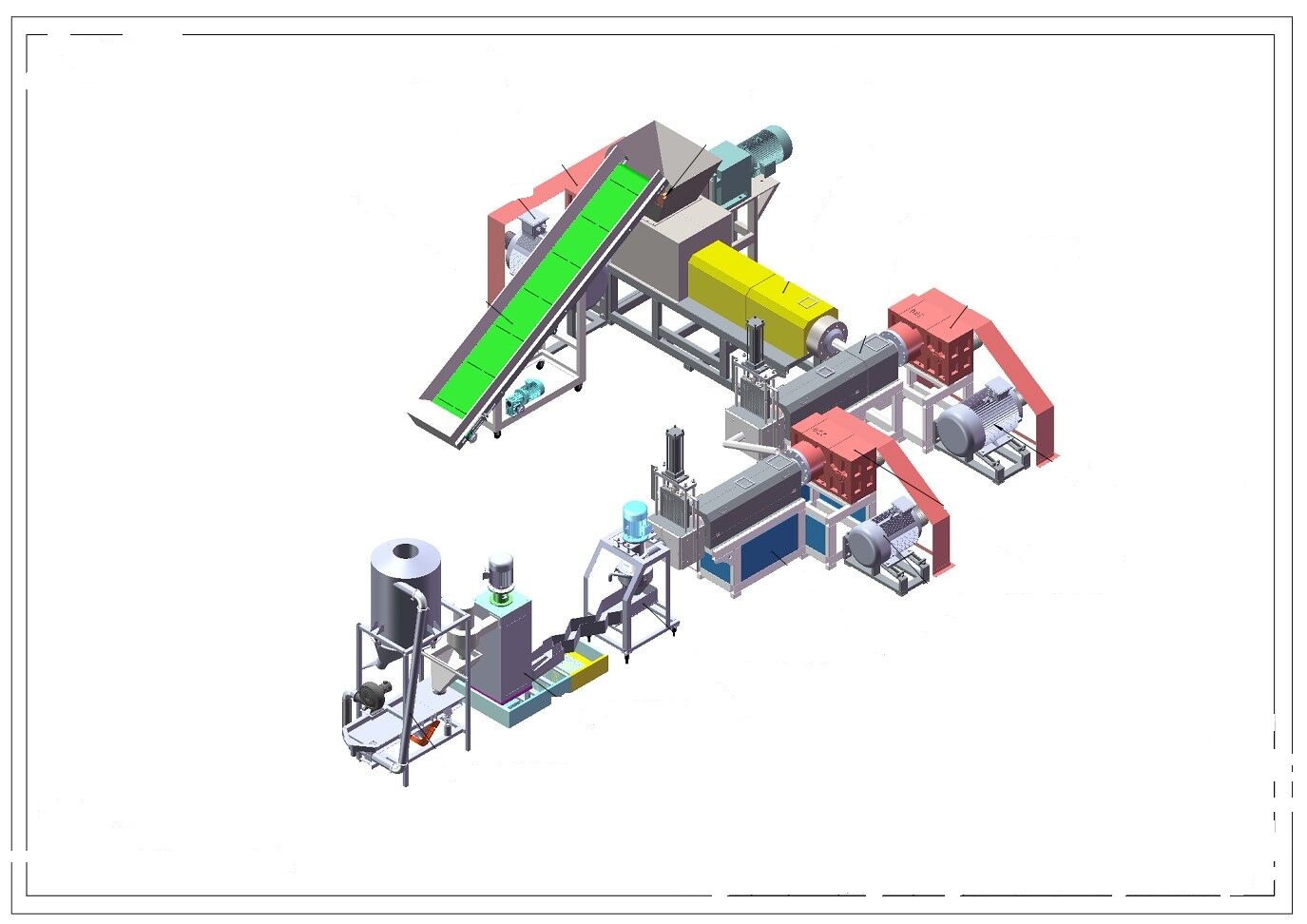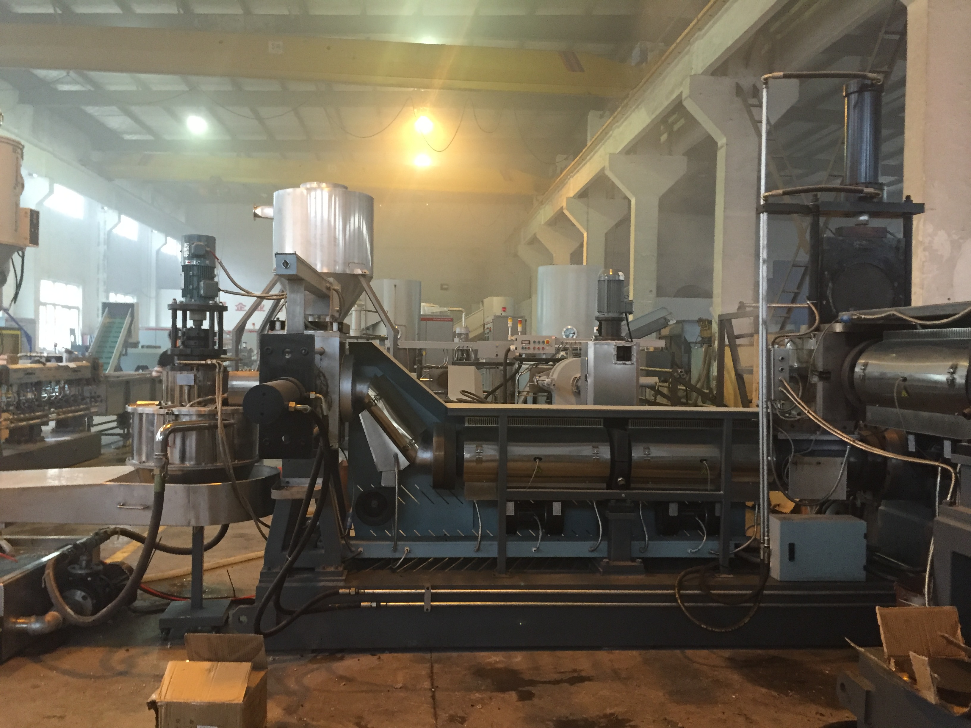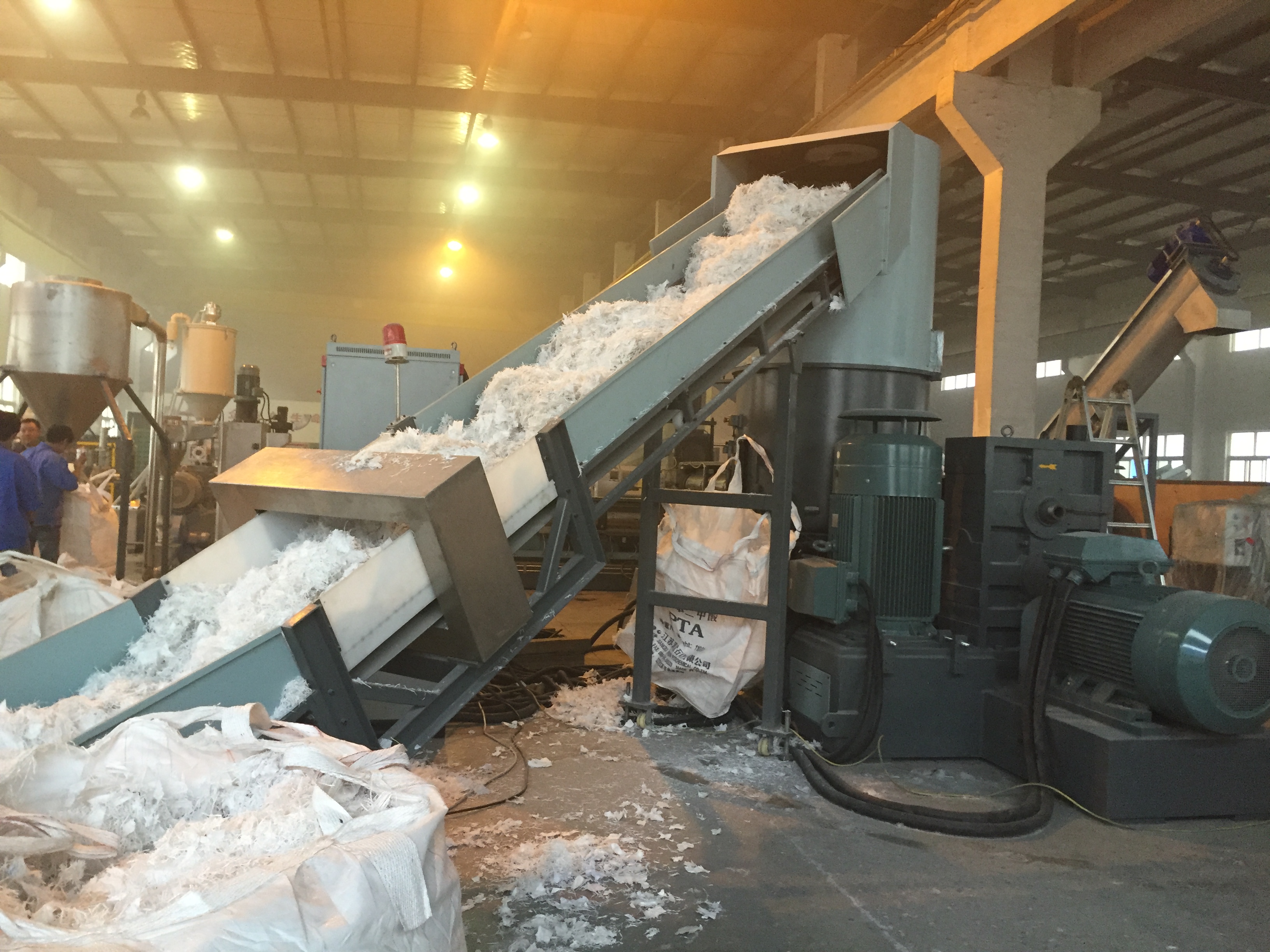 Классическая схема грануляции дроблёных мешков и бигбегов на одношнековом двухкаскаднике. На втором каскаде виден подъём колена вверх -для удобства работы оператора. Удобнее работать без "наклонки".