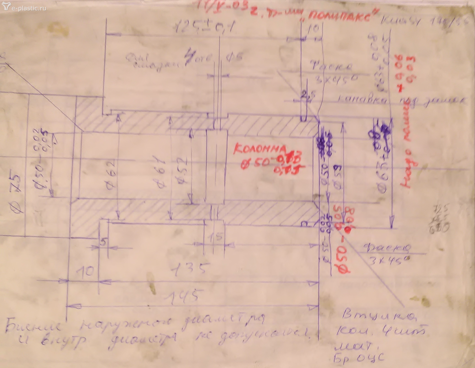 Для данного чертежа: Здесь два сопряжения . Колонна с отклонением. Поэтому и закон допуска и посадок нарушен вынужденно. Отверстия в плитах 63+0,02 Считаем это за ноль.Втулка сажается в плиту. Поэтому заложена посадка легко прессовая. С подгонкой, коррекцией по месту. И доработкой наружного диаметра втулки по месту. Может быть погрешность в исполнении отверстий в плитах. Отверстие принимается за условный ноль. Втулка подгоняется по наружке. Что касается колонны: Всвязи с тем что диаметр колонн занижены от нормы. Не зря отмечено красным!Именно в этом случае применительно к конкретному ТПА. И размеры внутри втулок занижаются для обеспечения рабочего зазора. Также при посадке втулки в отверстие плиты надо учитывать усадку внутреннего диаметра втулки. И обеспечить скользящую посадку. По опыту. Прежде чем принимать решение по размерам. В случае заказа деталей впрок при большом станочном парке , делают с припуском.Внимательно производятся реальные замеры колонн и отверстий в плитах. Конечно не штангенциркулем!Надо понимать что не параллельность плит на этом ТПА по четырем точкам базового квадрата 100 ×100мм норма 0,08 мм. И люфт в колоннах и втулках не допустим. Иначе возникнет провис подвижной плиты. И как следствие, не параллельность, не соосность плит. Работа для перфекционистов. Всегда делай хорошо, плохо само получиться.
