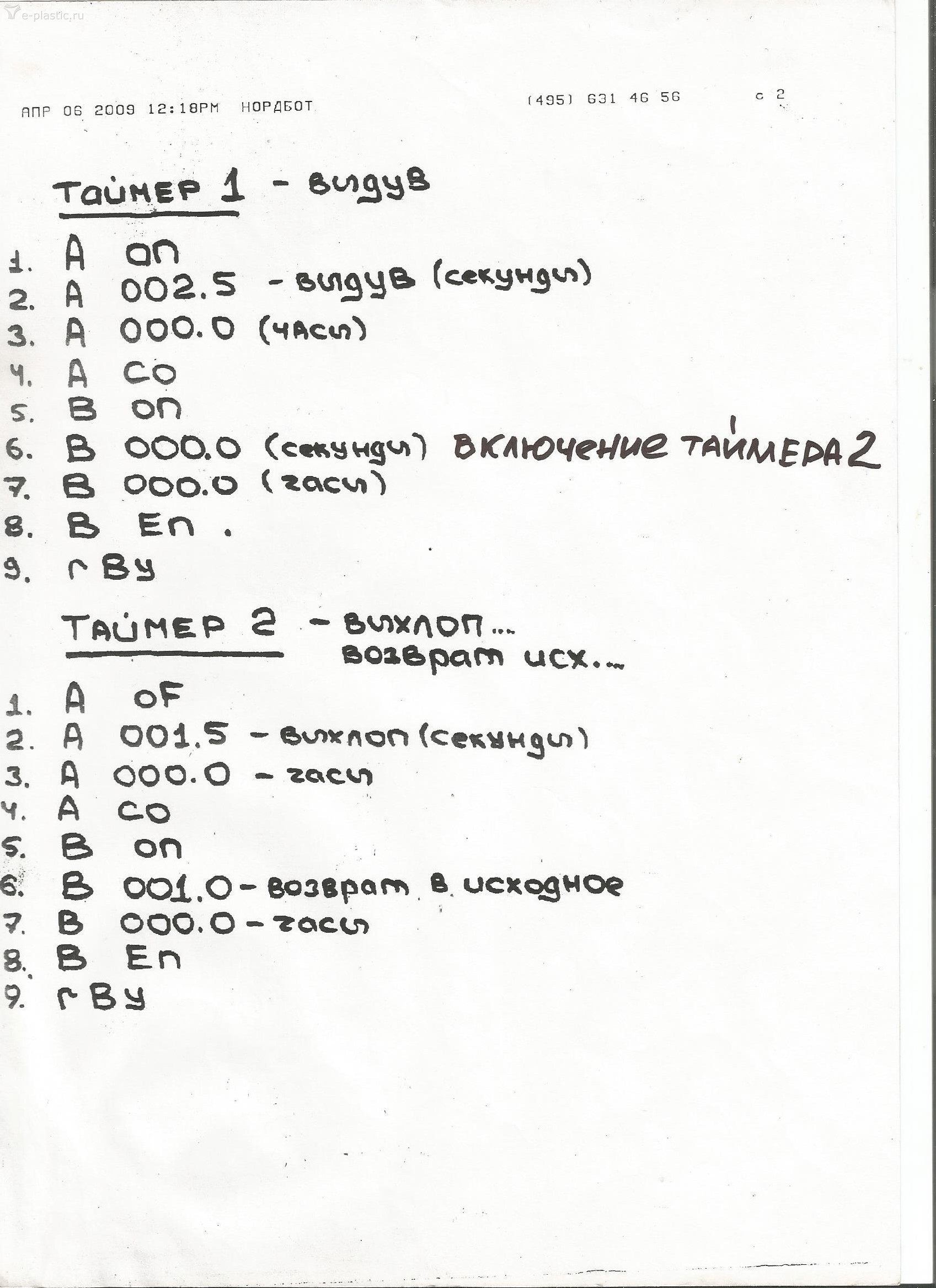 Если принять за отправную точку штатную схему вашего станка, то ПВ должен включаться в момент срабатывания верхнего геркона. Дутье бОльшим давлением должно включаться при срабатывании нижнего геркона. Дальше 1 временная уставка, после нее 2.