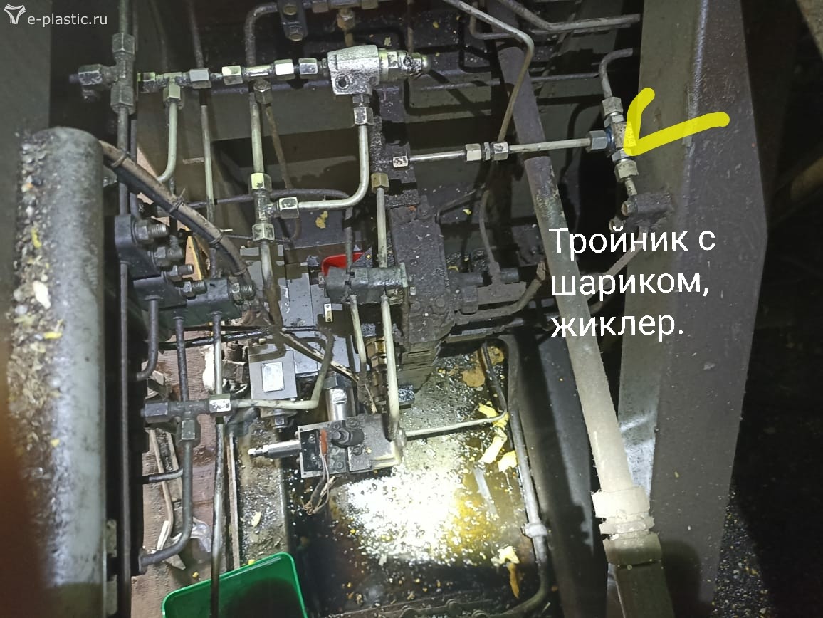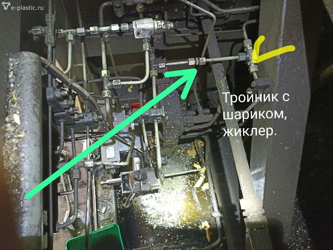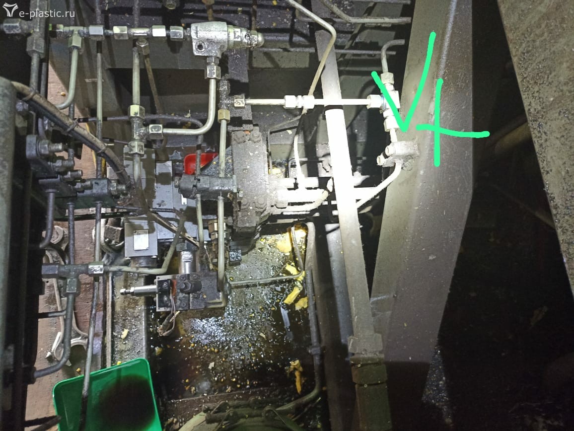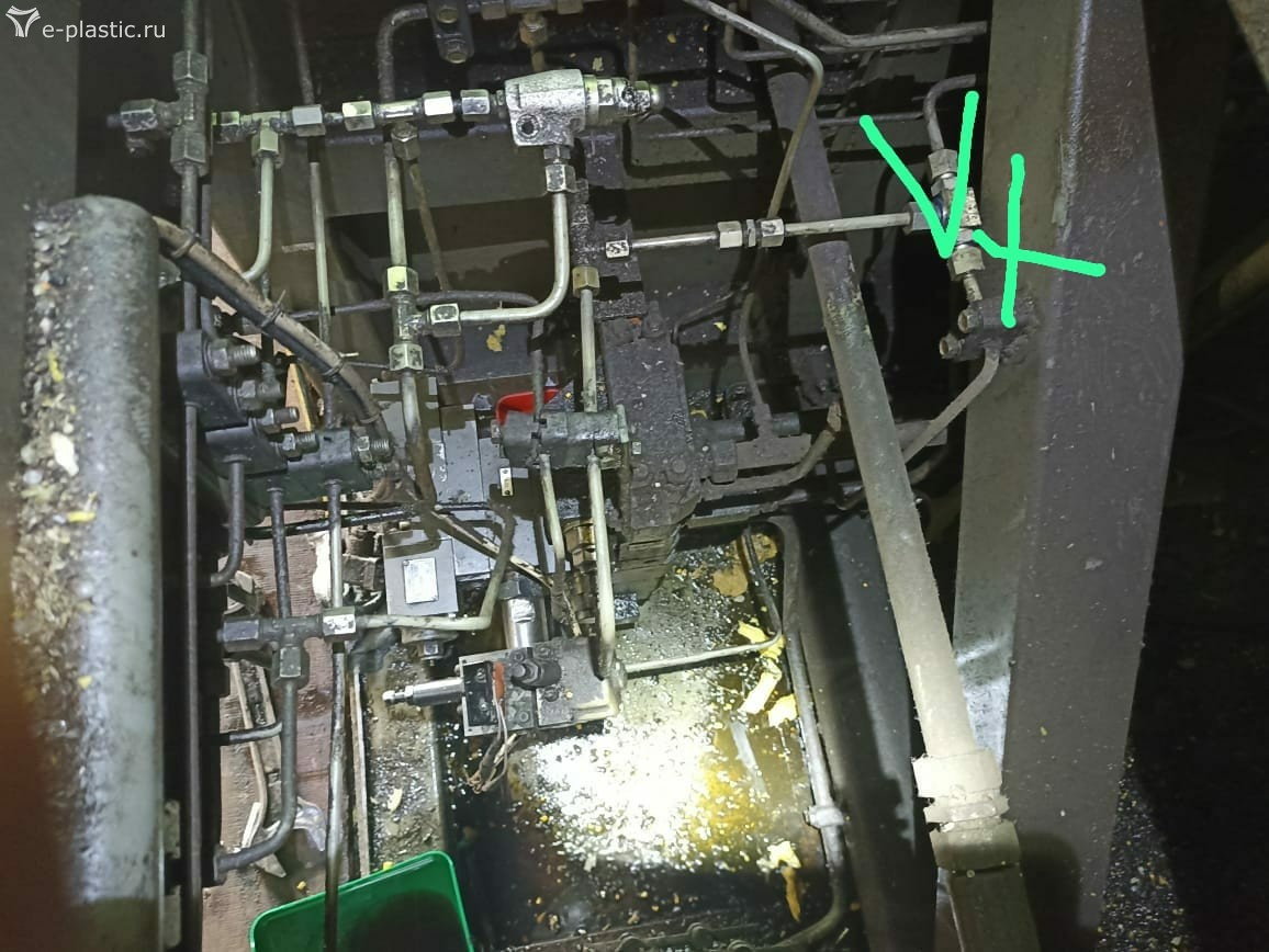 Ищем замок, жёлтая стрелка указывает трубку которая прикручена к голове замка. Идя по трубке придем к тройнику штуцеру где и найдём жиклер. Проверить так: Откручиваем трубку, включаем насос, нажимаем кнопку отвода сопла. Если из трубки тишина, засорен жиклер в линии управления. Завтра узнаем. Окрестности Ясногорска. Давление по паспорту в наладке тут 60 атмосфер. От насоса управления шестеренчатого. Который закреплен на основном аксиальнопоршневом насосе.