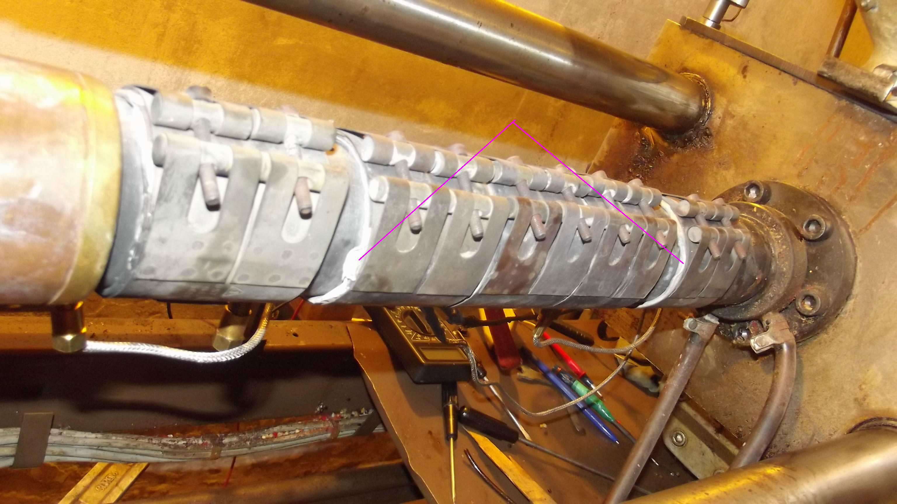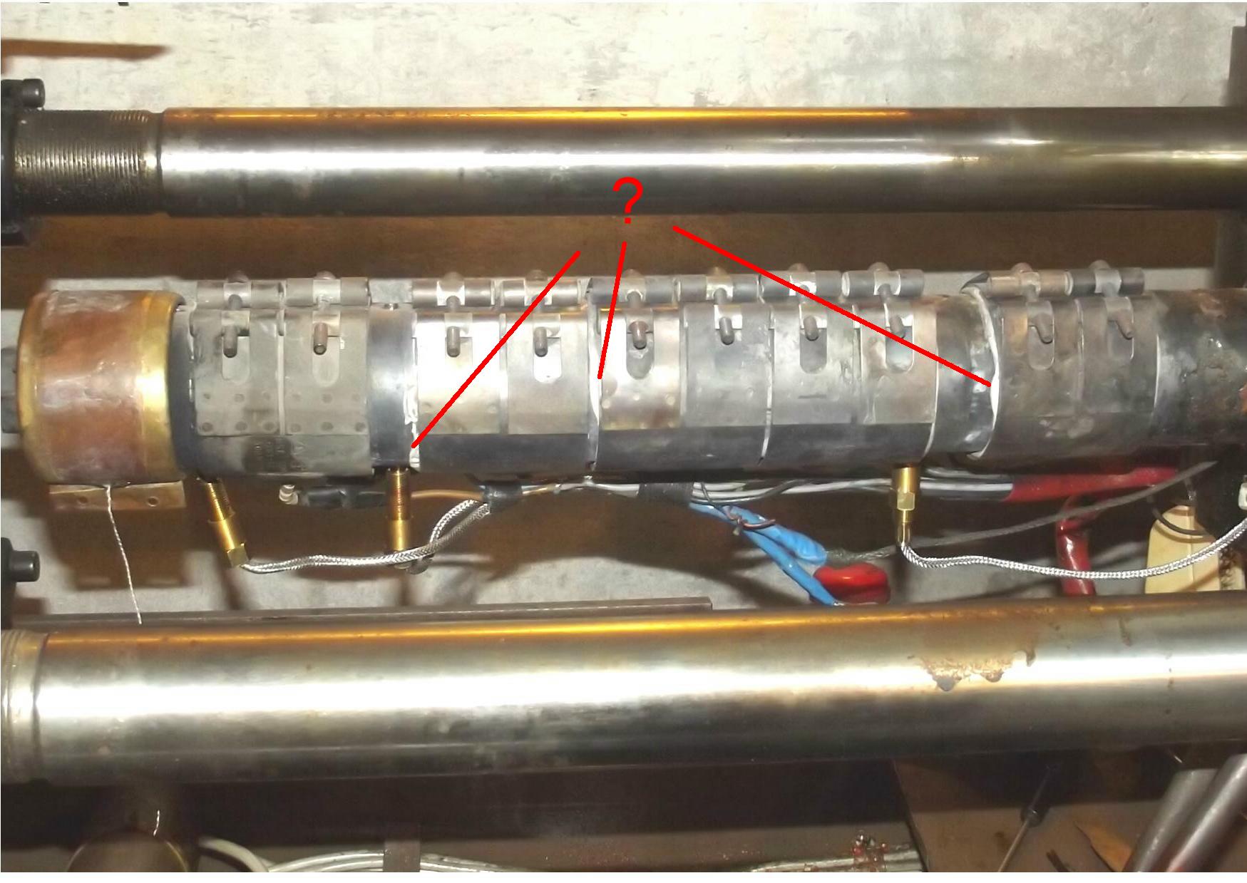 По выползающему металлу, вроде нагреватели не родные? Возможно не хватало диаметра цилиндра и проложили алюминиевые прокладки, чтобы элементы сошлись и не болтались.