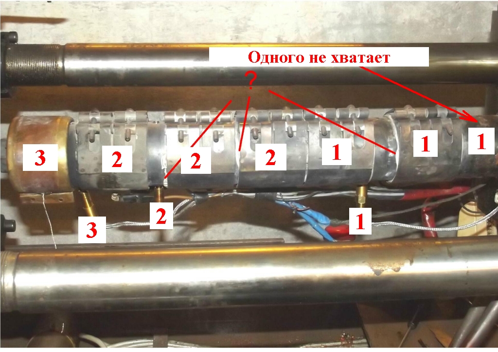 Кроме того, есть ли возможность на этом цилиндре передвинуть термопары, мне кажется их такое расположение (они проводами вниз желтого цвета) не очень. Где расположены для них посадочные отверстия, кроме тех, в которые термопары вставлены, сстесствинна? Термопары именно просто вставлены и держатся в принципе навесу, резьбы какой-либо в отверстии нет. Каким образом они будут держаться? Прикипят? Сейчас они от руки при небольшом усилии вытаскиваются.