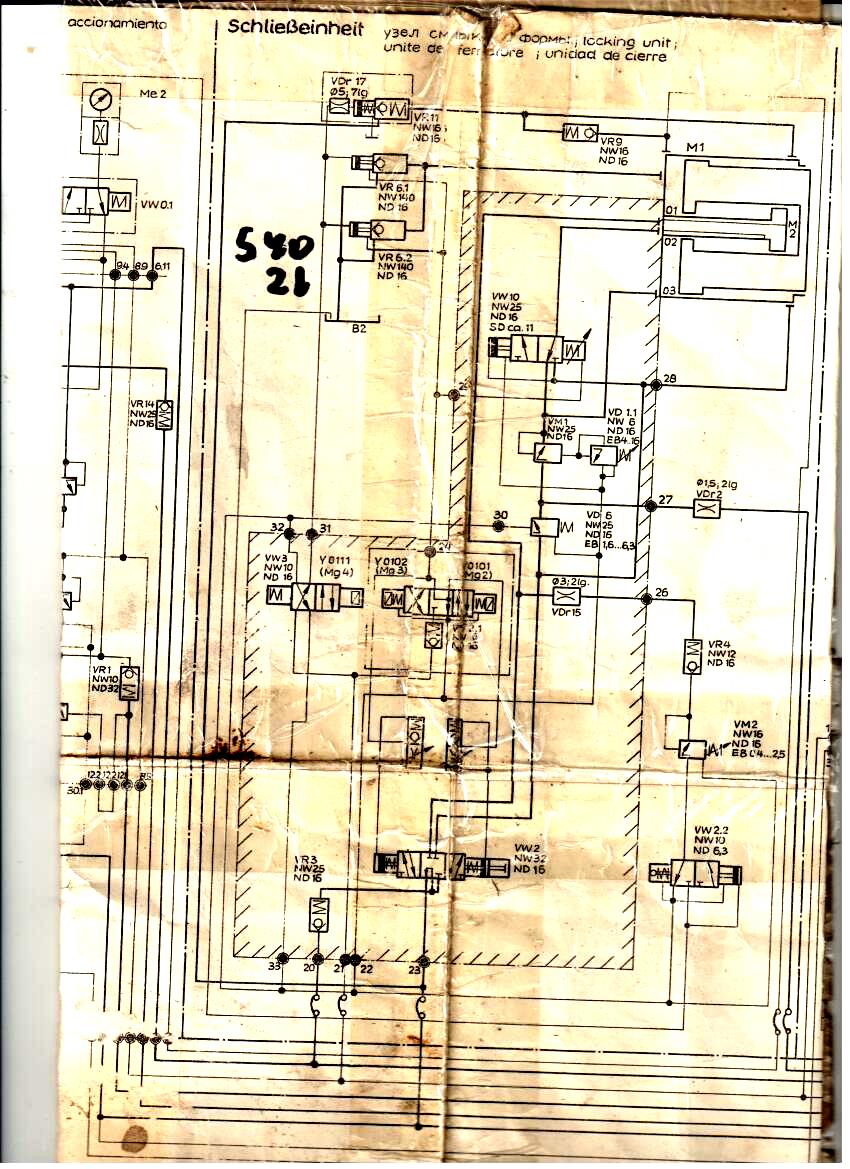 При включении У 111 в точке 32 обязано появиться давление и подойти к VW2.2 и вытолкнуть шток. если этого нет А на манометре ВД3 что в этот момент???. Не полная информация. !!! если давление ВД3 сохраняется не правильно работает У111. Если вы открутили ВР4 и смотрите в момент смыкания (смыкание- что какие магниты включены в этот момент.1) один У101.? 2) один У111? Можно описывать подробнее с фиксацией давления и наличия номеров включенных магнитов. Ведь ситуация простая. При одном включенном У101 плита движется от основного рад. поршн. насоса. При включении одног У111 плиту должен двигать шестер. насос ВД3. Из точки 32. Труба на улице легко проверить. И манометр управления ВД3 что кажет? Вопрос ( подставил ведро) в каком направлении от куда течет тонкая струйка? От точки 26 или со стороны VM2 -одно это о многом может сказать. Из скупых описаний ни чего сказать нельзя. Можно только выстроить целый ряд версий. При подробном описании можно много версий опустить и сказать точную причину или их минимум.( Даете сообщение и исчезаете. на несколько часов.) В выше описанных рекомендациях масса наводящих вопросов важных для меня и почти все проигнорированы.Xenomorph писал(а):итоги, воскр. вечер. поверил цепочку от точки 32 до точки 26. особо можно было и не проверять, раз шток из VW2.2 YT не выходит, значит и давления там нет. снимал VR4 -работает, проверил керосином, залил немного на выход и надавил пластмаской -керосин вытек. разобрал WV2.2 двигается нормально и достаточно легко. разбирал VW3 y111 магнит проверил, работает. золотник свободно движется. Наконец отвинтил вход VR4 подставил ведро, будет что будет... при работе на холостых вообще не течет, при движении на смыкании маленькая тонкая струечка.
