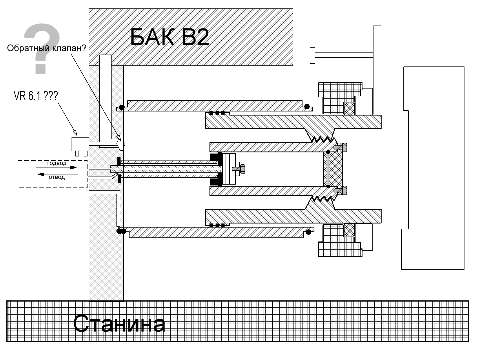 - При включении У101 давление управления то насоса управления 30 атмосфер приходит в штоковую полость двух цилиндров ВР6.1 и ВР6.2 и обязано переместить чашки конические большого диаметра на закрытие при условии что Включенный У111 обеспечивает свободный слив с противоположной полости цилиндров в бак ( верхний бак Б2) если этого не происходит? Либо распределители не корректно работают либо падает давление на рваных уплотнениях цилиндров, либо цилиндры подклинивает. А в тот момент когда суете болтк активируя 4021. Большое количество масла поступая в основной цилиндр после подключения У21У22 помогает чашкам захлопнуться. Действия: Ревизия распределителей, переборка цилиндров, контроль давления ВД3. 30кг. Попробовать поднять до 40 кг. Кратковременно рискнуть и поднять до 50-60. мы пробовали поднимать и до ста. Но можно сломать насос. ZP2.