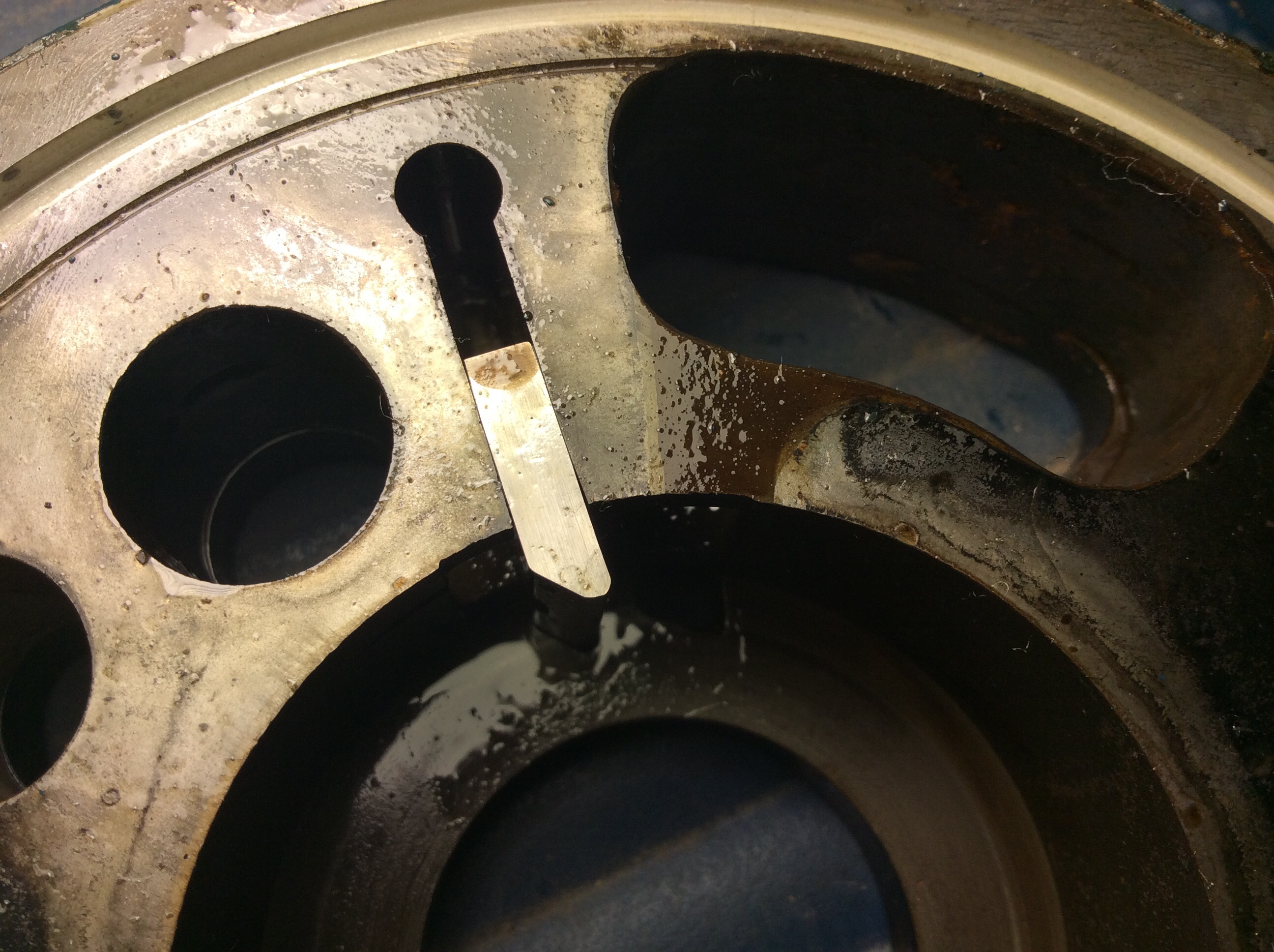 Настройка пружин- поджим пластин служит лишь для того что бы в момент старта насоса и работы на холостых оборотах обеспечивать контак пластин с эксцентриком кулачка. Принцип такой: Масло упираясь в пластину проходит по канавке и попадает под тыльный торец пластины обеспечивая стабильный прижим пластины к ротору- кулачку. То есть на высоком давлении у пластины отбросится от кулачка шансов нет. А что бы пластины быстро не изнашивались и устроен скос определенного размера, что бы сила изнутри была чуть больше чем с верху рабочего торца. При работе в холостую сила падает и пружина помогает удерживать контакт пластины с кулачком. Когда пластина изнашивается и паз, то сила с нижнего торца падает за счет перетечек и пластина начинает отставать от ротора и появляется пульсация, перегрузка пружины ведущая к ее поломке. При сломе пружины даже одной, пластина западает и насос просто перестает качать. Регулируем по месту, что бы пластина была прижата а с такой силой- я определяю руками, чтобы и не сильно и не слабо. Вал провернуть рукой тяжеловато . Если крутить рукой за сам вал. Кручу гаечным ключиком. Даже при слабом натяге с хорошими пазами и пластинами работать должен безупречно. если посмотреть на ярком свете внутри пазов и на пластинах видны износы. И у каждой пластины получается своя лыжня, и путать местами это "труба." В момент работы пластины прижимаются в новую геометрию горбатую плоскость и коэфициэнт трения высок и пластину заедает, управление поджим из нутри не справляется со своей задачей заставить пластину копировать Элепс , стремящийся на оборотах в 1500 ее отбросить. Встречались пластины в ужасном состоянии, просто чайные ложки, и если не путать места приработанных деталей насос продолжал работать. Но это не панацея скорее случайность.Чикман писал(а):Да, плоскости. Поставил точно крест на крест. Даже проверил вращением вала качения коромысел. Скосы на встречу вращению. Ну я конечно еще раз проверю все. Вопрос: на сколько плотно должны быть прижаты пластины? Какова методика регулировки прижима? Ясно, что чем больше прижато, тем герметичней, но при этом греться сильнее будет и нагрузка на электродвигатель больше.ЗЮМ писал(а):Единственное что при сборке мог перепутать.... )))))) ВВЕРХ ногами имеется ввиду что? Плоскости? Если плоскости . То повлиять не должно. Вот если один эксцентриковый ( я их кулачками зову) кулачек относительно другого крест накрест не поставил тогда да. Но в этом случае пластины бы болтались. А подкладки в этом случае привели бы к поломке пружины и давлению ноль. Потом скосы на пластинах навстречу вращению стоят? на фото видно что на встречу. Аможет одну пластину и проморгали. Все равно надо проверять.